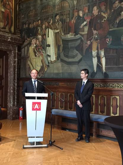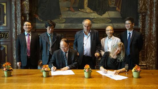 下午,安特卫普市副市长克劳德先生(Marie-Claude)在市政厅举行隆重仪式欢迎刘洪一一行。在克劳德先生的见证下,刘洪一与安特卫普大学联盟主席帕斯卡女士(Pascale De Groote)签署合作协议,进一步密切学术交流和人才培养等各领域的合作。刘洪一在致辞中指出,乐竞平台与比利时安特卫普皇家美术学院的合作历时13年,我们期待在中国“一带一路”倡议背景下,进一步拓展与安特卫普大学联盟在设计创新、医疗教育、音乐美术等优势领域的交流。