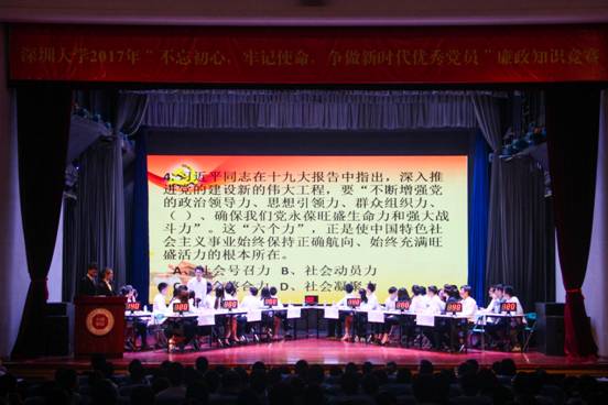 来自法学院、经济学院、管理学院、土木工程学院、信息工程学院、建筑与城市规划学院、生命与海洋科学学院、数学与统计学院、师范学院、计算机与软件学院、电子科学与技术学院、机电与控制工程学院等12个学院的师生共同参与此次廉政知识竞赛。竞赛氛围热烈浓厚,学生精神积极昂扬,竞赛过程紧张而又活泼,充分展现了深大学子的精神风貌,显示了深大人敢于走在时代前列,为习近平新时代社会主义事业添砖加瓦的动力和决心。