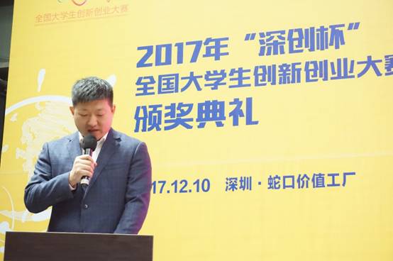 王晖代表乐竞平台向获奖团队师生和高校表示祝贺。王晖表示,“深创杯”大赛始终秉承“创新、协调、绿色、开放、共享”的理念,与各“承办联盟”高校和“联合执行”单位一道,共享资源、共建平台、共担责任、共赢成果,实现了让每个参与者都有满满的获得感。“深创杯”参赛选手不仅进行比赛竞技,还参加创业实战训练;指导老师不仅研讨双创教育,还实地考察深圳双创环境,参赛师生不仅捧回了证书、赢得了奖金,还拓宽了人脉、交流了思想、获得了资源、更新了理念。王晖具体解释了“深创”的涵义,他说“深”是汇聚深圳的“深”,是深化改革的“深”;“创”是大众创业的“创”,是万众创新的“创”,从“深创杯”到“深创联盟”,将是我们不断深化共识、持续深入合作进入崭新阶段。