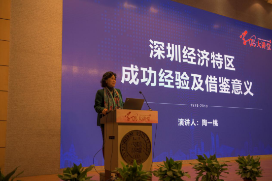 陶一桃发表了题为《深圳经济特区成功经验及借鉴意义》的主题演讲。她表示,作为中国最成功、最典型的经济特区,在中国的改革开放史上还没有哪一座城市能像深圳这样发展得如此迅速。陶一桃从中国经济特区背景、经验、借鉴意义等方面,系统、全面、深刻地介绍了深圳的成长历史和成功经验。她认为,对深圳经济特区的成功经验及借鉴意义的总结具有重要的教育启迪意义,为深刻认识改革开放,进一步坚定改革开放提供了理论思考和事实依据。