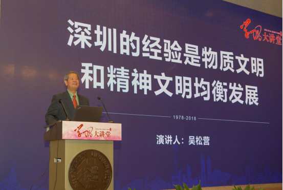 吴松营做了《深圳的精神是物质文明和精神文明均衡发展》的主题演讲。吴松营从见证者、参与者、推动者角度出发,阐明深圳之所以在五个特区中拔地而出,迅速发展,成为改革开放最前沿、最成功的地区的主要原因,就是注重党的建设,是追求“物质文明和精神文明”相互促进的结果。他表示,深圳特区始终高度重视物质建设与精神文明建设,并一直遵照马克思主义、毛泽东思想、邓小平理论和习近平总书记的重要理论,这是深圳特区沿着正确方向不断发展前行的根本保证。深圳未来的发展也要继续弘扬这种理性精神。