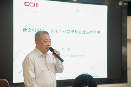 范周做了题为“新文科时代,文化产业管理专业建设的思考”发言,他介绍了文化产业建设管理管理专业建设经历的从无到有的发展历程,并提到文化产业管理专业建设与国家战略紧密相关、人才培养的核心是“立德树人”、需与其他专业进行交叉融合、要重视创意人才的挖掘和培养等特征。他表示,在一场“质量革命”带来的“新文科”发展机遇的背景下,文化产业管理专业建设大有可为。