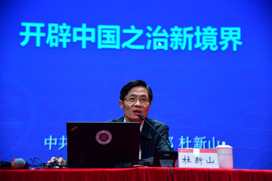 杜新山以《开辟中国之治新境界》为题,从“如何认识全会主题及其重大意义”“如何理解坚定中国特色社会主义的制度自信”“如何把我国制度优势更好转化为国家治理效能”三个方面,对党的十九届四中全会精神进行深入解读。