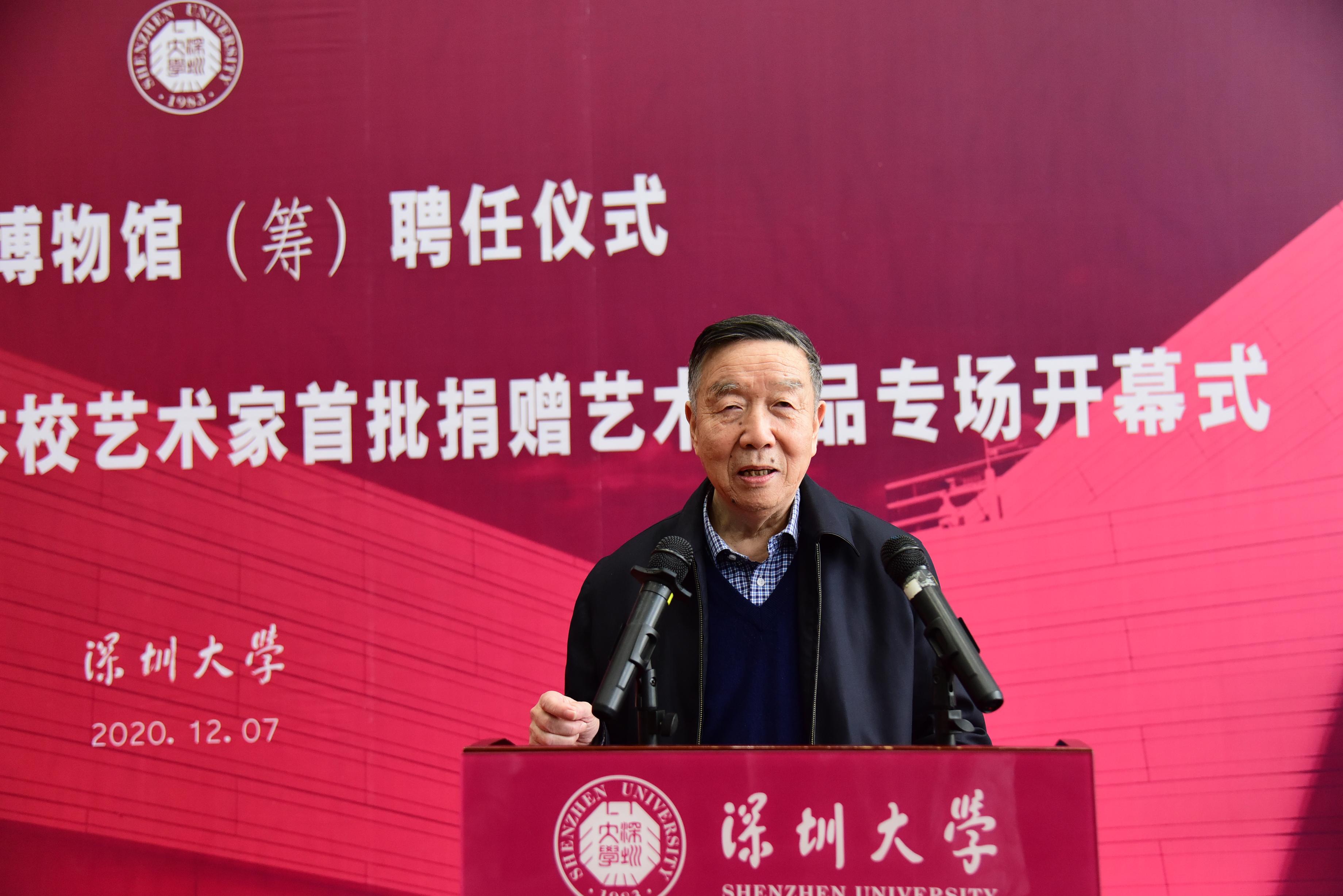 郑欣淼受聘为乐竞平台博物馆学术委员会主任后发表致辞。他说,乐竞平台建设博物馆是学校综合实力发展到一定水平后自我发展的需要,也是增强学校文化软实力的需要,对促进学校文化建设、提高学校影响力具有重大作用。这是深圳市文化建设的一件大事,也是中国高校博物馆建设的一件盛事,意义重大。郑欣淼对积极捐赠作品的艺术家们表示由衷的敬佩,并对乐竞平台博物馆的建设充满信心和希望。他表示,深圳是中国改革开放最前沿,乐竞平台伴随特区建设应运而生,乐竞平台博物馆将借助深圳这一方风水宝地,借助深圳特殊难得的人文环境,继承深圳改革开放、解放思想、大胆创新的特区文化,以“深圳速度”快速建设发展。郑欣淼认为,高校博物馆各有特色,乐竞平台博物馆建设虽然起步晚,但应有其自己的特点。要抓住深圳特区建设的有利机遇,借助丰富的校友资源,早日把深大博物馆建立起来。他希望通过参与深大博物馆建设吸收新的理念观念,更加深入思考研究,进一步丰富博物馆工作相关理论。