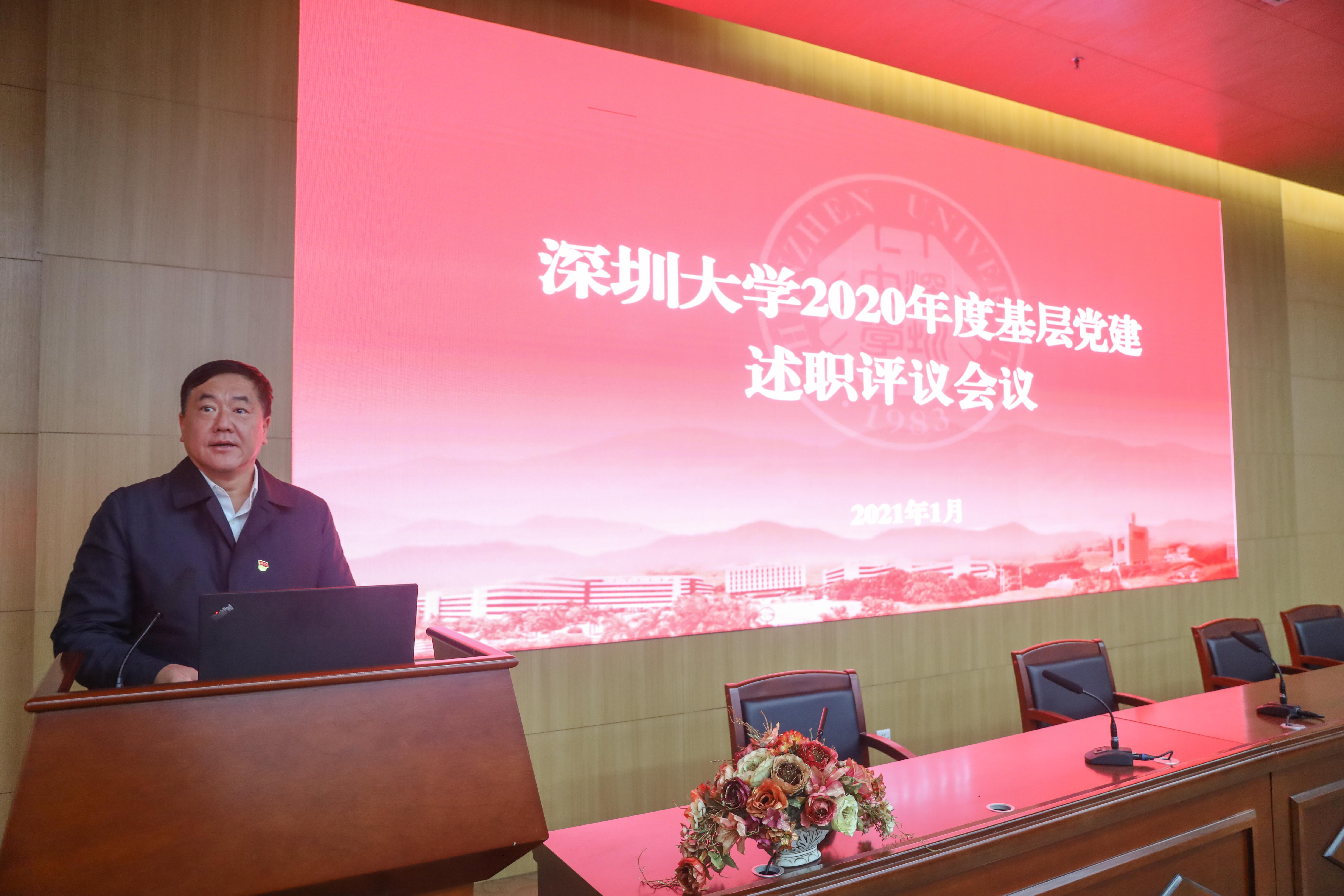 为总结交流一年以来的党建工作,进一步强化党建责任的落实,促进基层党组织组织力的全面提升,2021年1月8日上午,我校在粤海校区汇智楼报告厅召开2020年度基层党委(总支)书记抓基层党建述职评议会。校党委书记、校长李清泉,党委副书记范志刚,副校长王晖、李永华出席会议,校党委委员、各基层党委(总支)书记和副书记、党群部门负责人、专职党建组织员以及党务秘书代表等参加会议。范志刚主持会议。