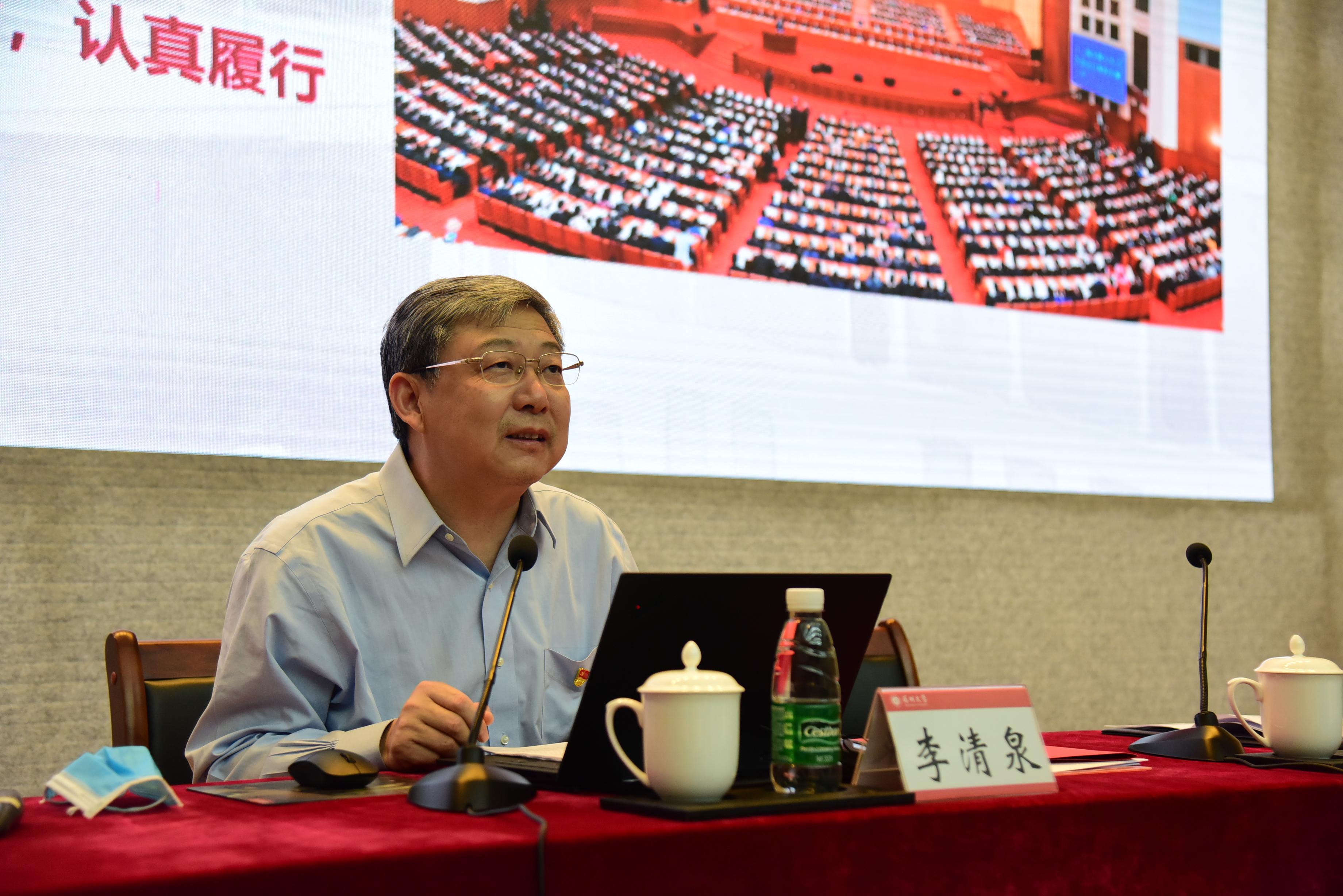 会上,李清泉详细介绍了十三届全国人大四次会议的召开背景、会议概况,重点传达了习近平总书记参加部分代表团审议和看望参加政协会议医疗卫生界教育界委员重要讲话精神,详细解读了2021年政府工作报告、《中华人民共和国国民经济和社会发展第十四个五年规划和2035年远景目标纲要》(以下简称《规划纲要》)《全国人民代表大会关于完善香港特别行政区选举制度的决定》等主要内容;结合广东省代表团主要活动及其参会履职情况,具体阐释其关于“尽快落实和扩大在深高等学校办学自主权”“促进内地香港高等教育双向互补合作”的建议,并分享了参会见闻及学习心得。