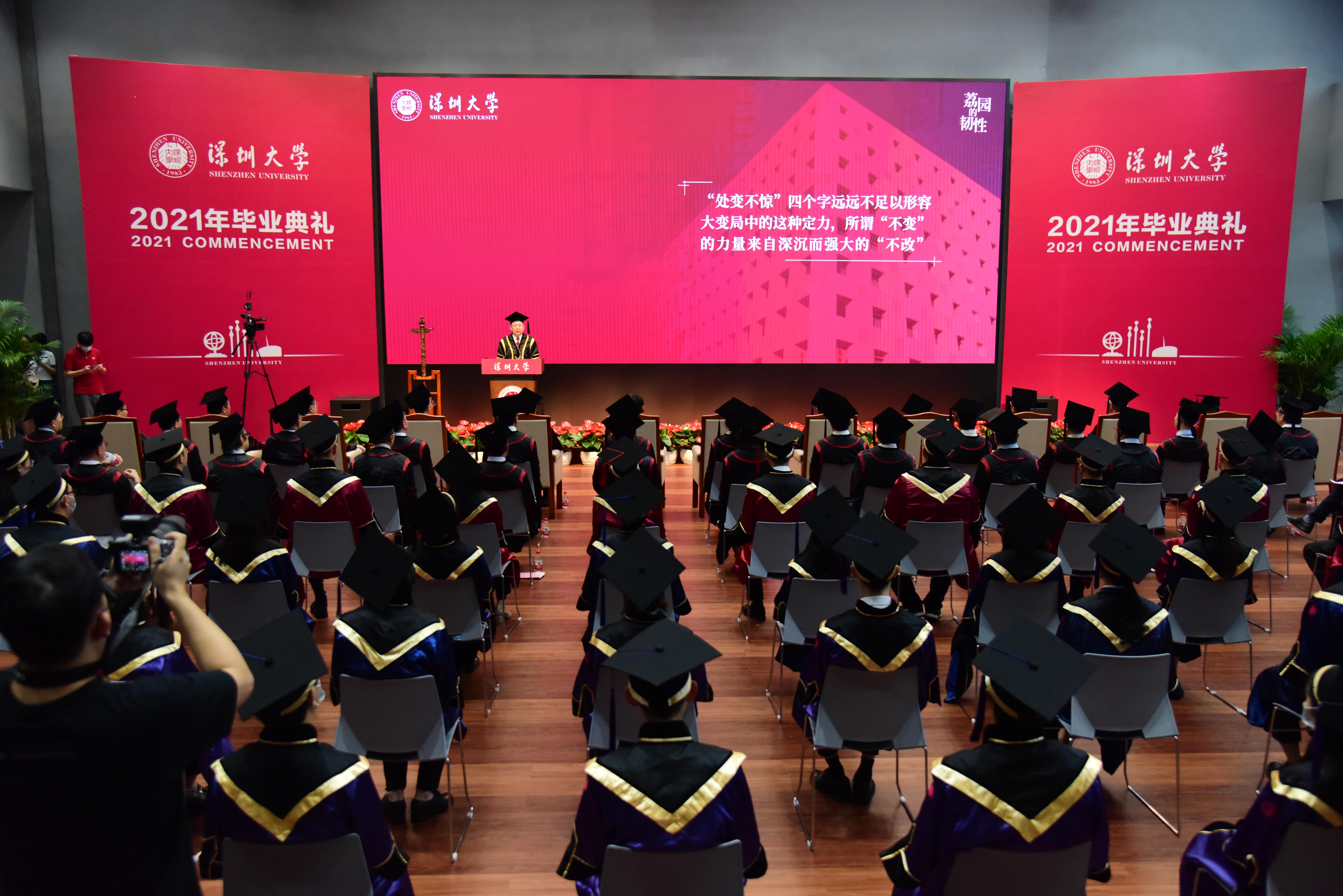 因受疫情的影响,本次毕业典礼采取“主会场+分会场”“线上+线下”的方式,并首次启用新建成的校友广场作为主会场。典礼规模上虽按照疫情防控要求进行了控制,但典礼的仪式不变,品质不降,隆重依旧。典礼全程通过南都APP、读特、深圳新闻网、壹深圳、新浪微博、抖音、B站、百家号等多家媒体及平台同步进行“云直播”,让身处各地的毕业生、老师、校友、家长,可以跨越山海、相聚“云端”,同步观礼,共同去见证这值得铭记一生的时刻。