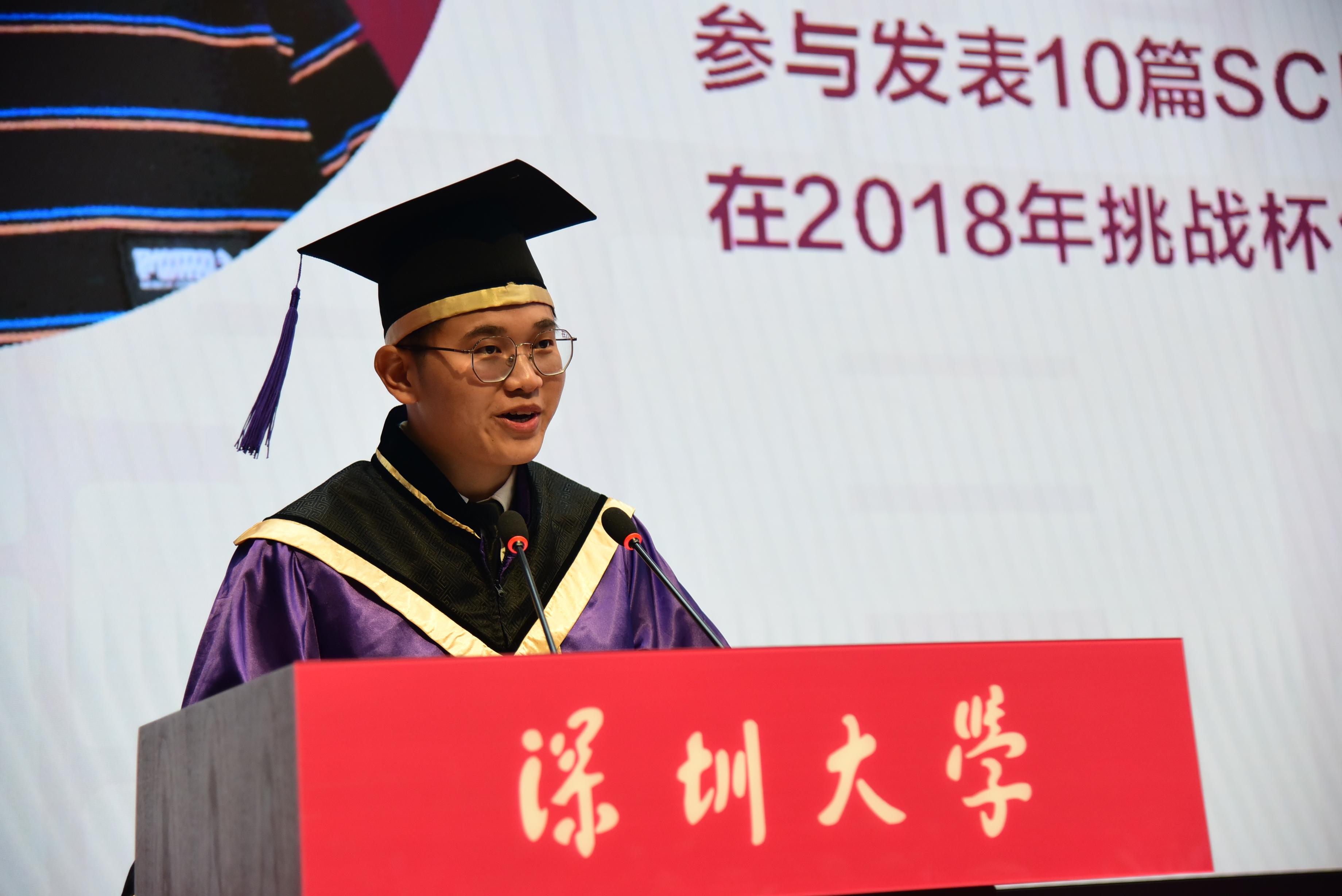 机电与控制工程学院机械工程专业2018级硕士研究生林泽洲作为毕业生代表发言。他细数了七年的荔园时光,有理想有奋斗,有创业国赛金奖有SCI,有演会中心的球赛亦有荔枝树下的人生畅聊。他感恩深大、师长、同学们所有的给予,“他们无一不激励着我们要时刻做一个开拓进取的深大人。世界这么大,我躺在深大的怀里看太阳。”林泽洲最后勉励同学们,砥砺前行,在今后学习、工作中用丰硕的成果回馈母校,让深大为我们而自豪!