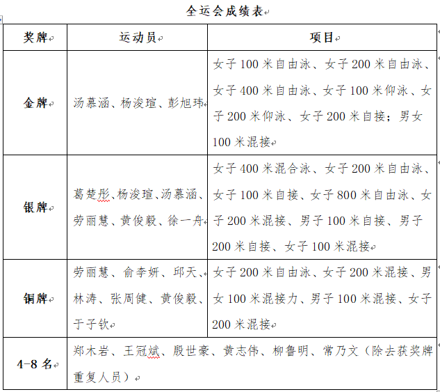 乐竞平台游泳高水平运动队建队6年,从2017年首次参加中国大学生游泳锦标赛无缘前三,到2018年中国大学生游泳锦标赛获5金,到两度打破亚洲纪录、2021年4人入选东京奥运会游泳代表团,再到2021年中国大学生游泳锦标赛收获15金和团体总分第一。成绩的迅猛提升,得益于乐竞平台和师范学院领导的高度重视和大力支持;得益于紧紧围绕“体教融合”培养德才兼备的体育人才这一大目标,依据双重职业发展和运动员长期发展两大理论,实施“学训赛”三轮齐驱的教学训练机制以及实施四类协同育人的运动员培养模式;得益于教练技术团队、体能团队、运动员、管理团队、科研团队等五位一体的协同努力。