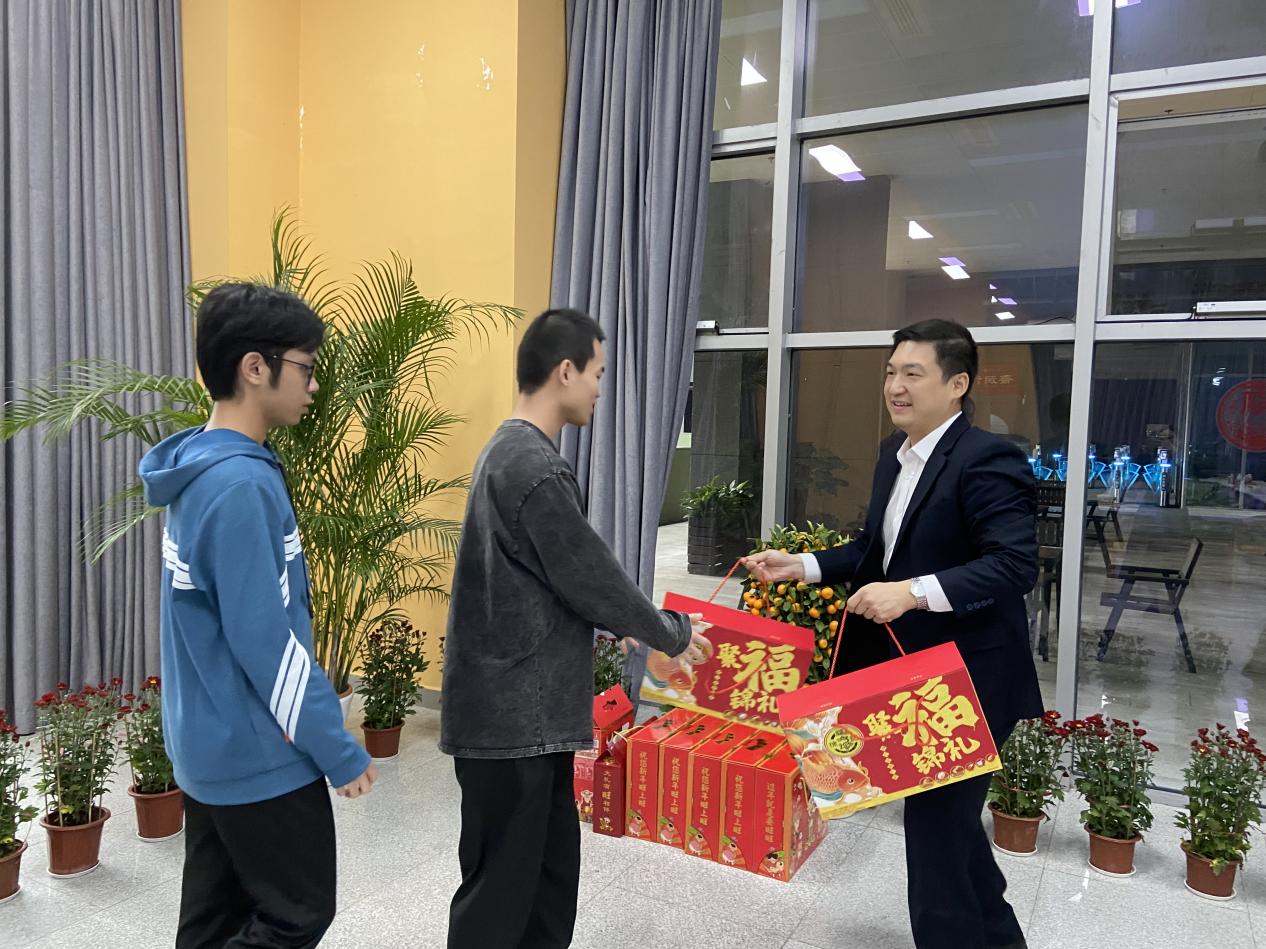 座谈会结束后,袁志雄、李述广还代表共青团深圳市委员会为深大留校学生代表送上慰问礼包,并祝福他们在新的一年,身体健康、学业进步,虎虎生威。