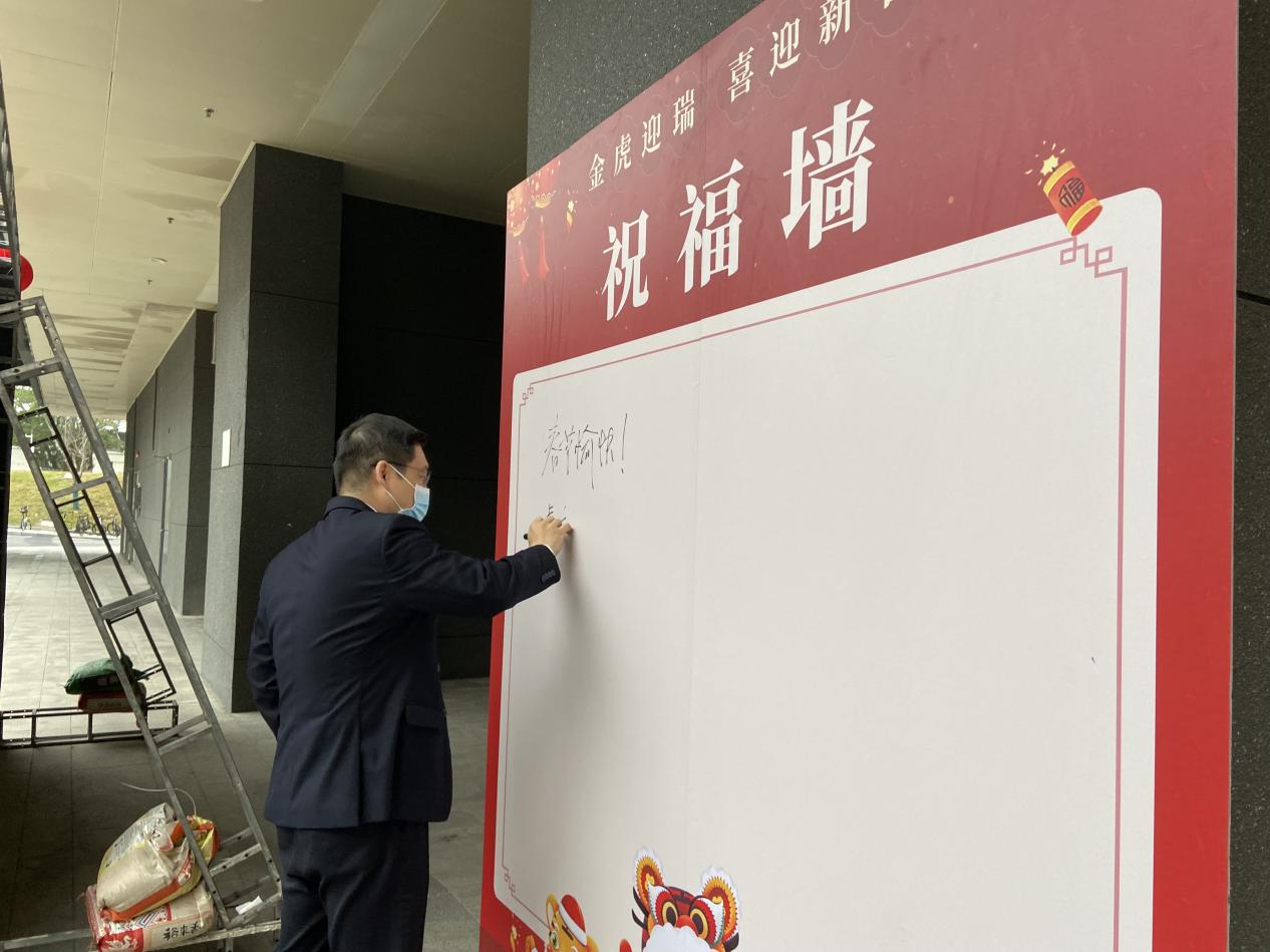 最后,袁志雄、汪永成、李述广在乐竞平台学生会“虎虎深大行”祝福板上为深大学生送上了新春寄语,并与全体参会人员合影留念。