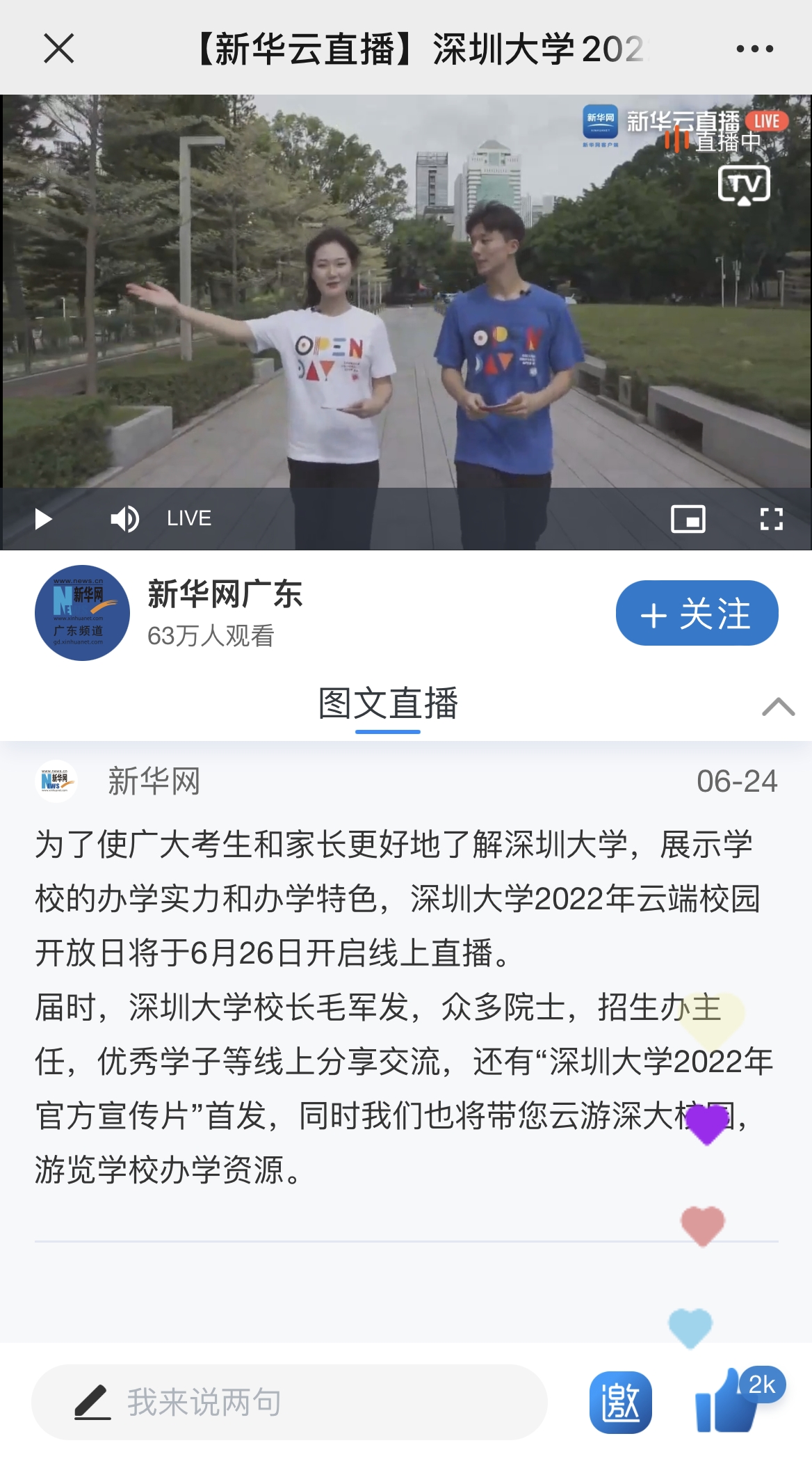 开放日活动在新华网、南方+、新浪深圳等中央、省级媒体及网络媒体,乐竞平台官方新浪微博、微信视频号、抖音、百家号、bilibili等平台同步直播,吸引大量考生、家长和网友的关注。