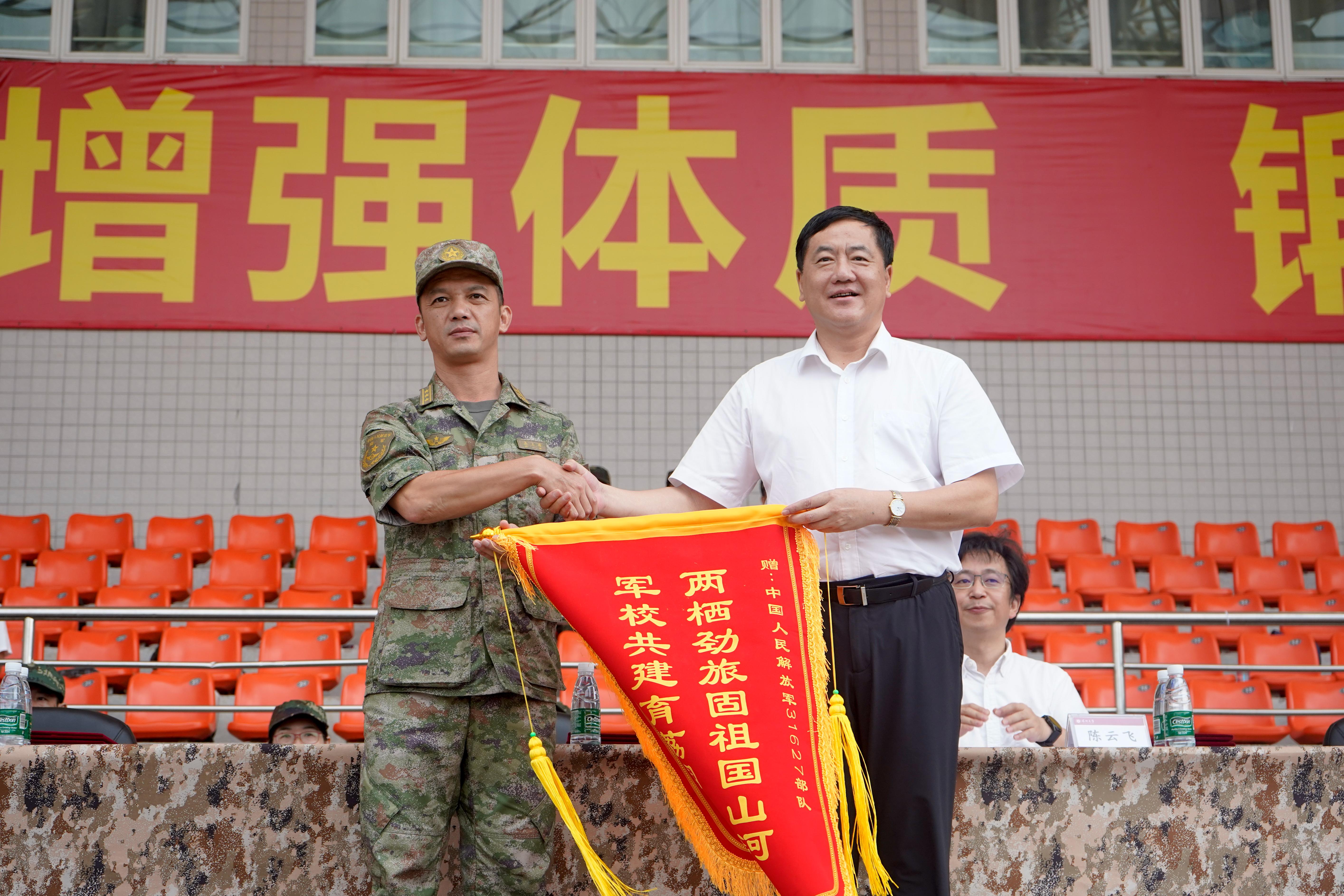 范志刚向承训部队赠送锦旗。武装部宣读表彰决定,范志刚、李永华为军训优秀教官、军训工作先进个人代表及军训优秀学员代表颁奖,并分别在两校区大会上讲话,向完成军训任务的新生表示祝贺,向承训部队和教官致敬致谢。