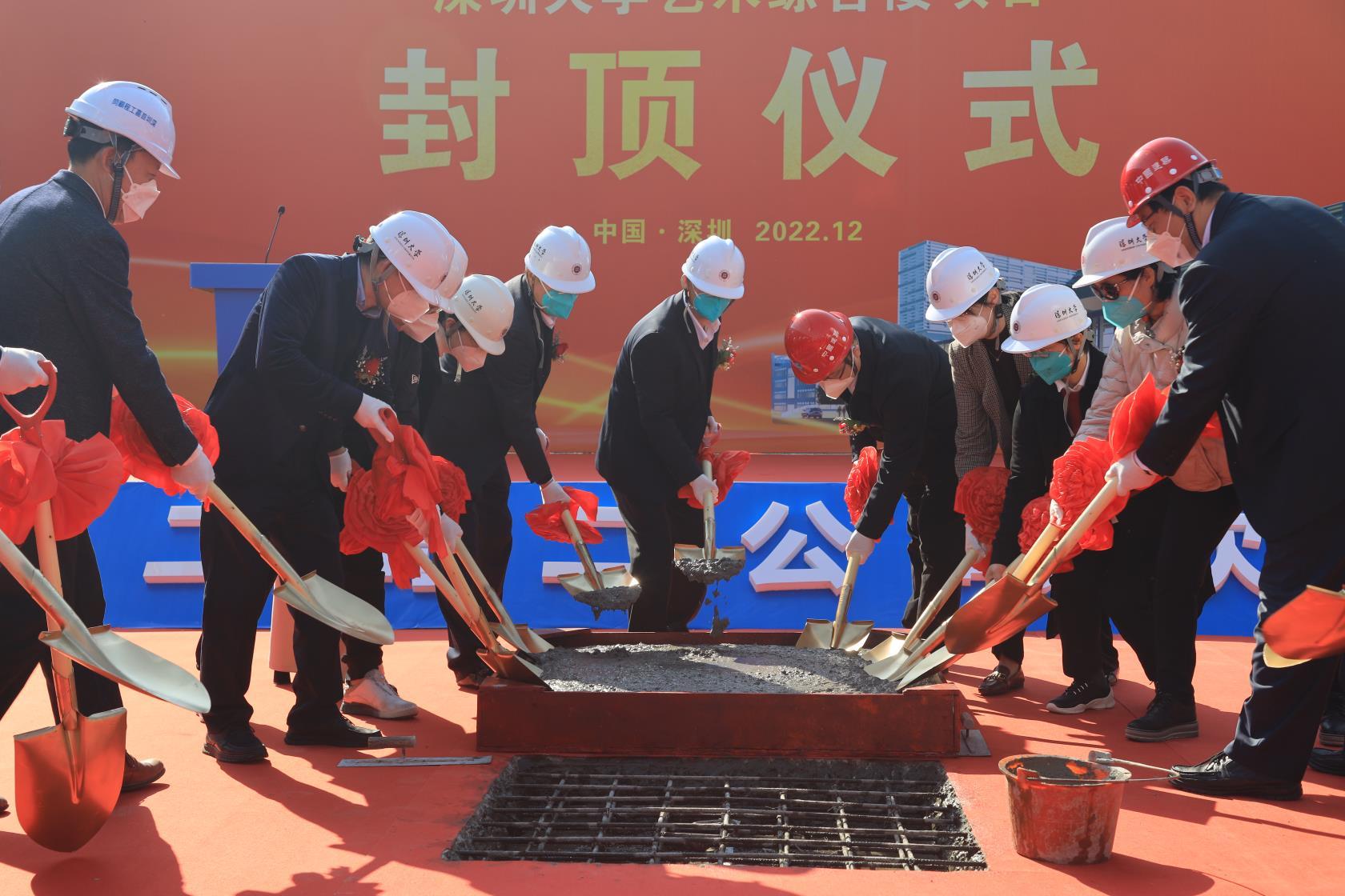 仪式最后,与会领导嘉宾同执金锹,共同浇筑艺术综合楼最后一块混凝土,至此乐竞平台艺术综合楼项目主体结构全面封顶,该项目建设也将迈入全新阶段。