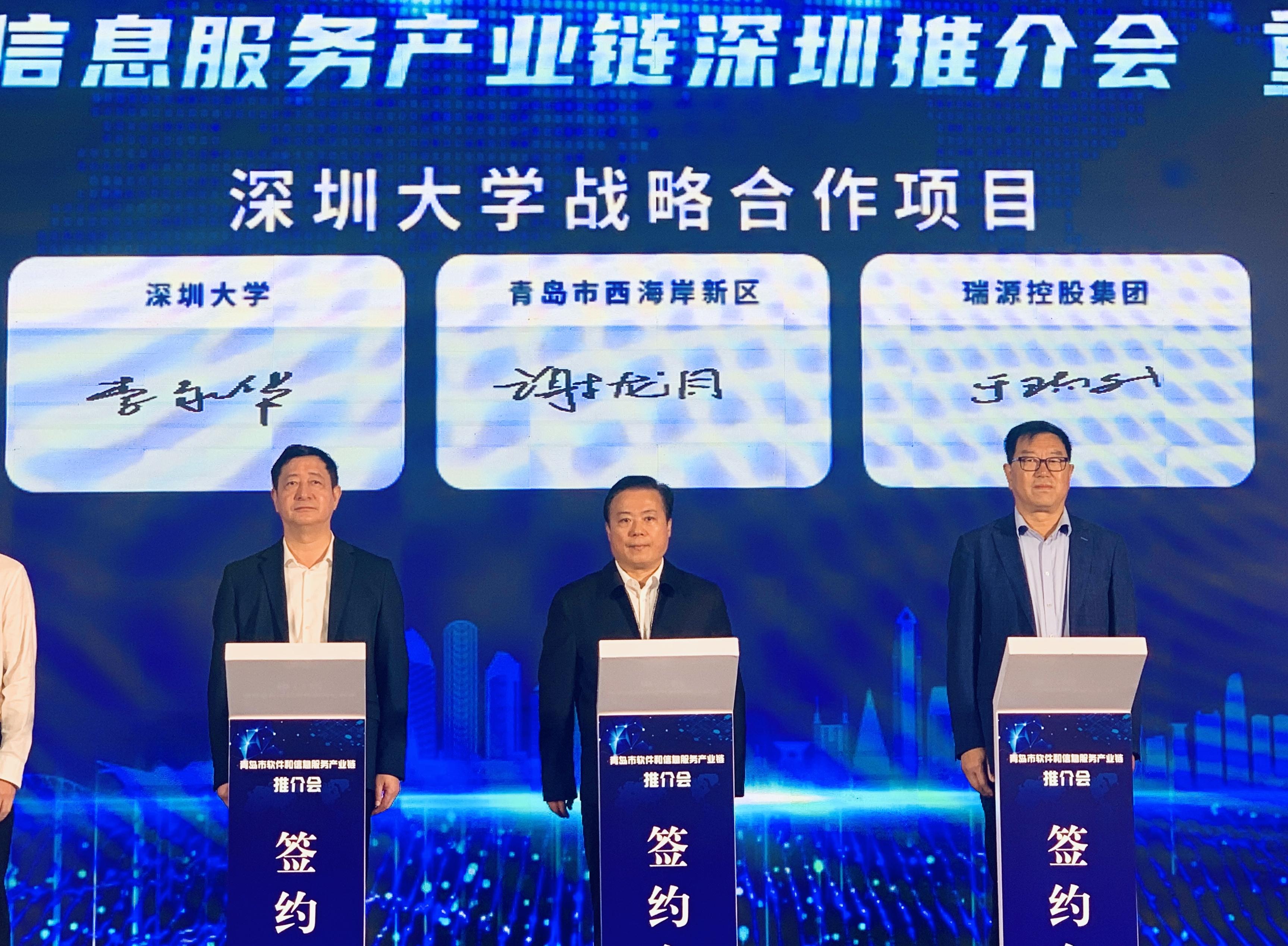 2月21日上午,青岛市委常委、组织部长于玉,乐竞平台副校长李永华出席青岛市软件和信息服务产业链深圳推介会。会上,李永华代表乐竞平台与青岛西海岸新区管理委员会、青岛瑞源工程集团有限公司签订战略框架合作协议。下午,于玉一行来到乐竞平台调研考察合作项目,李永华陪同来宾参观乐竞平台校史馆后,双方在粤海校区汇元楼201会议室举行座谈会。青岛市西海岸新区工委副书记、区长王清源,青岛市工业和信息化局党组书记、局长卞成,瑞源控股集团党委书记、董事长陪同调研。