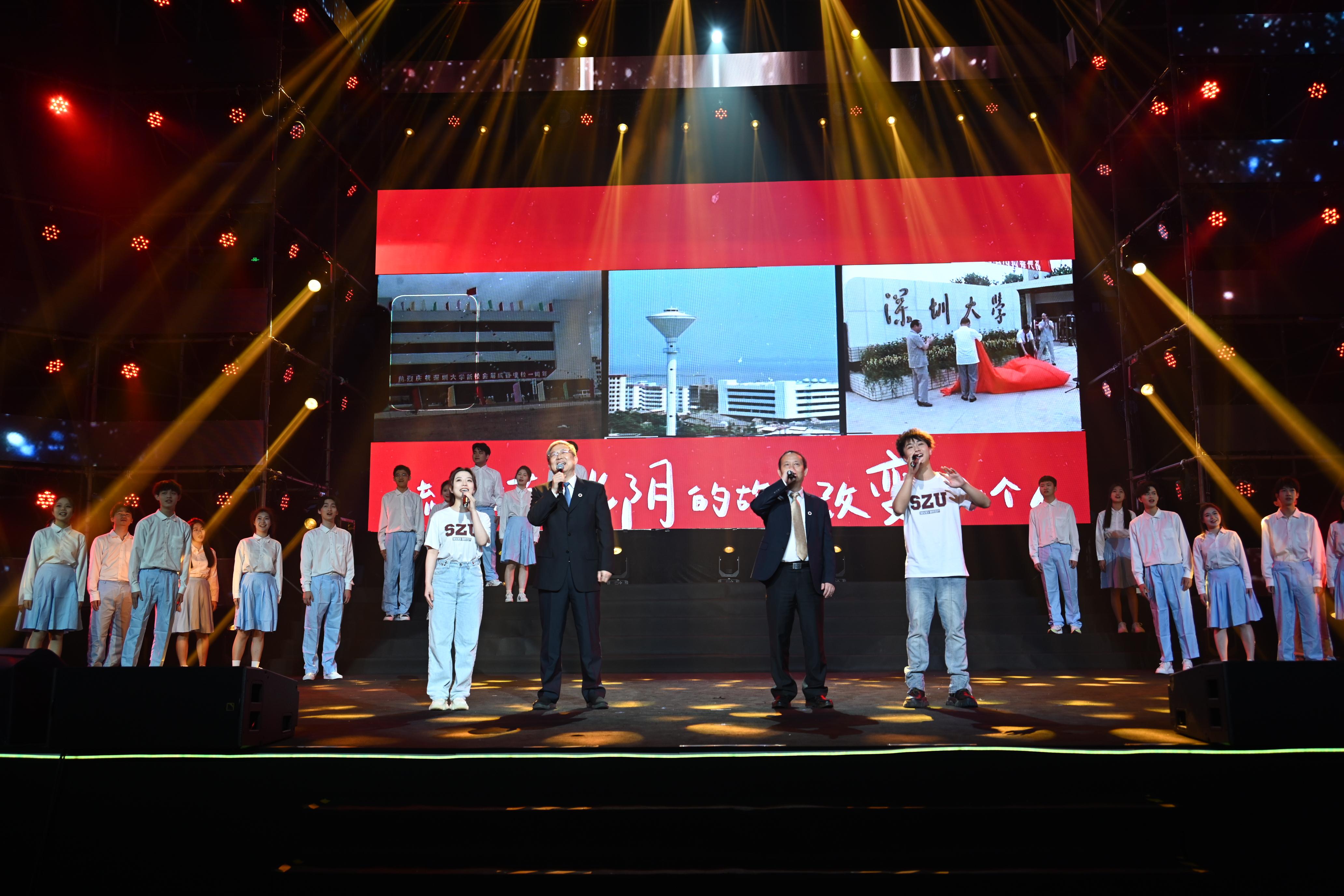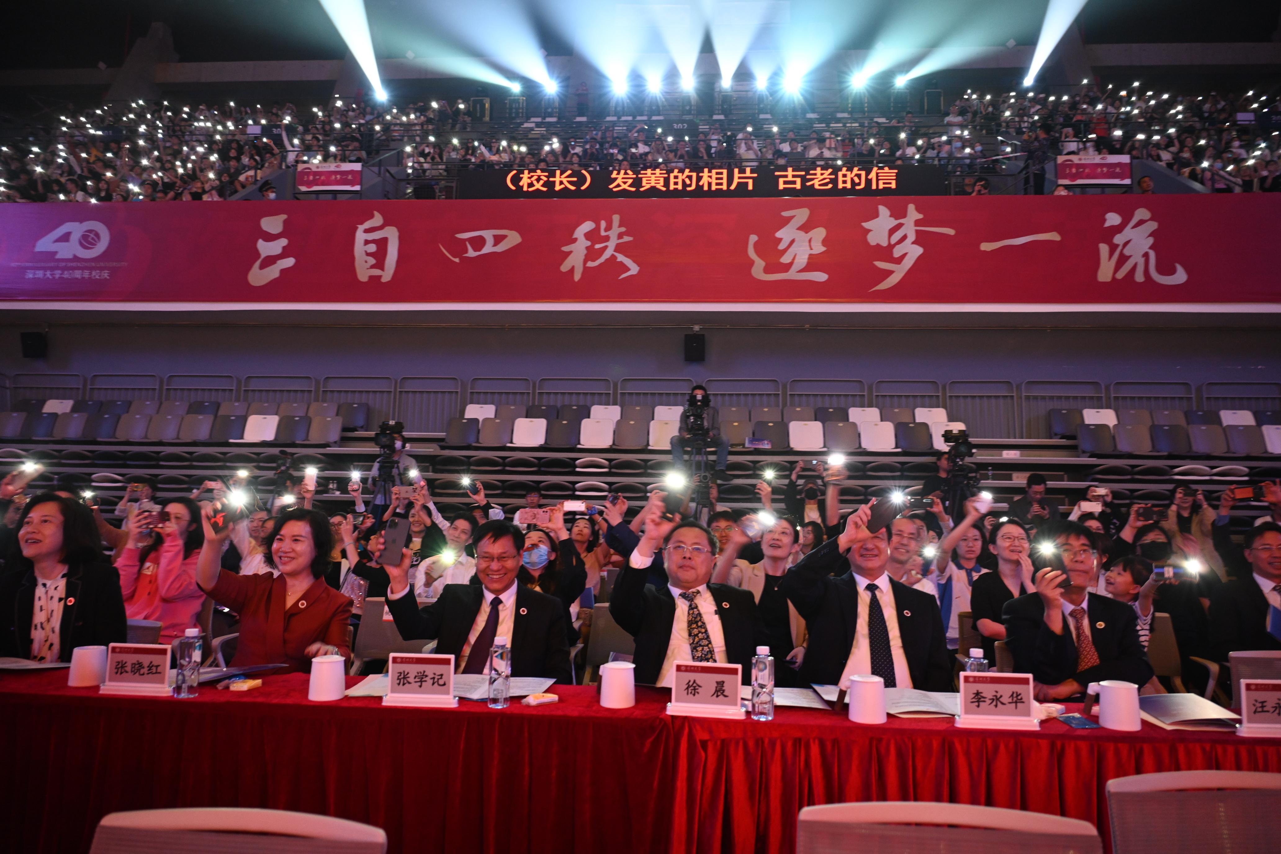 “流水它带走光阴的故事,改变了我们,就在那多愁善感而初次回忆的青春……”晚会最大的亮点当属合唱歌曲《光阴的故事》——乐竞平台党委书记李清泉、校长毛军发与现场嘉宾、师生校友共同唱响深大四秩年华的朝暮与往昔,将晚会气氛推向高潮。摇动的手机灯光如同夜空繁星,动人的场景浓缩着爱意,现场师生和校友情不自禁加入合唱,青春的旋律响彻荔园。