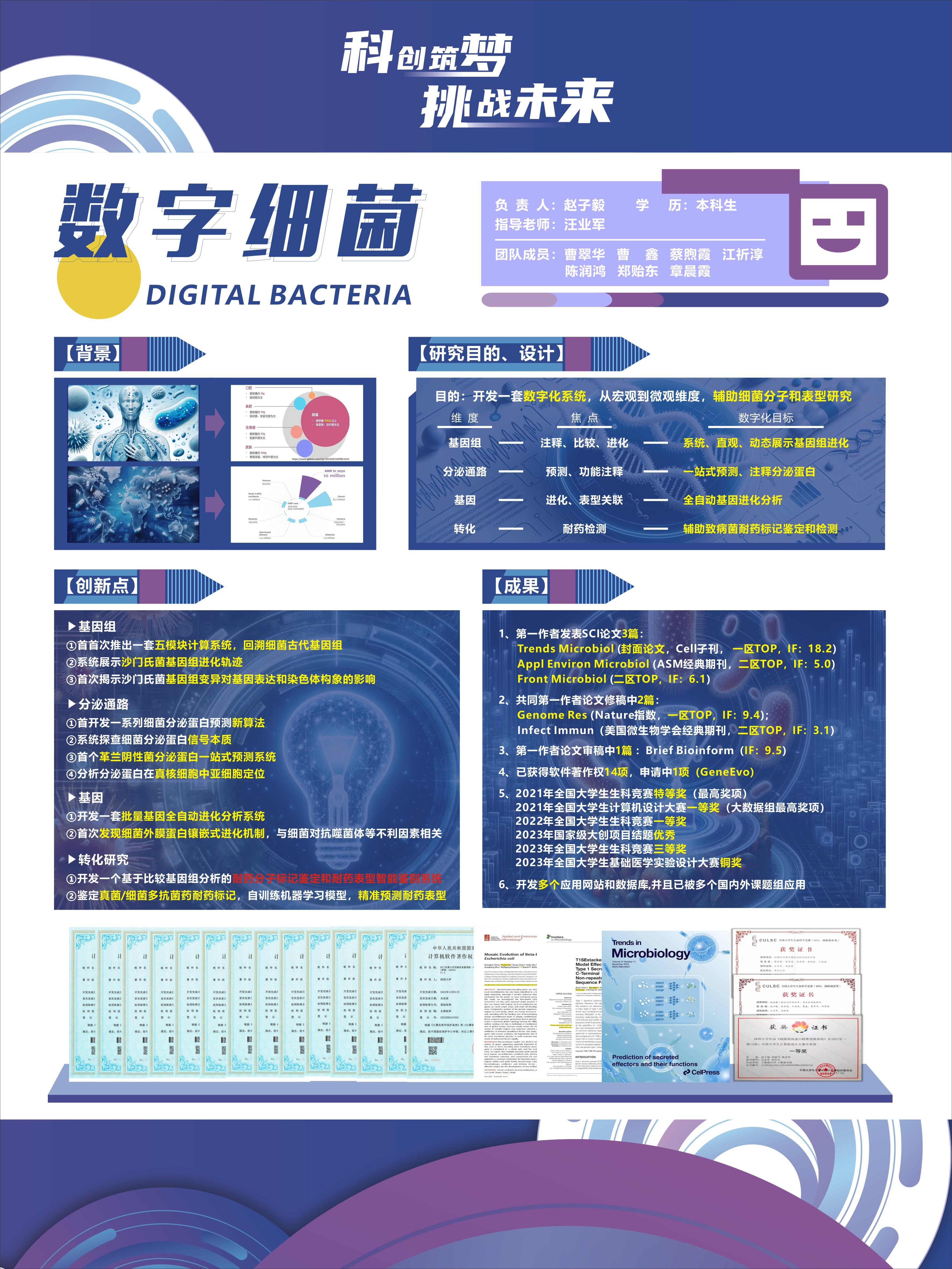 团队紧跟“十四五”规划,建设数字中国战略部署,研发全新的数字化技术,全力促进细菌的基础和临床应用研究。项目从基因组、分泌蛋白通路和基因水平展开研究。基因组层面,创新性将进化系统引入比较基因组研究中,直观展示基因组的进化轨迹。分泌蛋白层面,创新性提出新的特征解析及预测算法和框架,开发第一个细菌多分泌蛋白一站式集成预测和功能注释系统。基因层面,创新性开发自动地对细菌基因和基因家族进行批量、系统进化特征分析的系统。该项目通过三个层面的原创性算法、模型及工具的开发和应用,为细菌耐药的机制研究和临床诊疗实践提供重要的指导。
