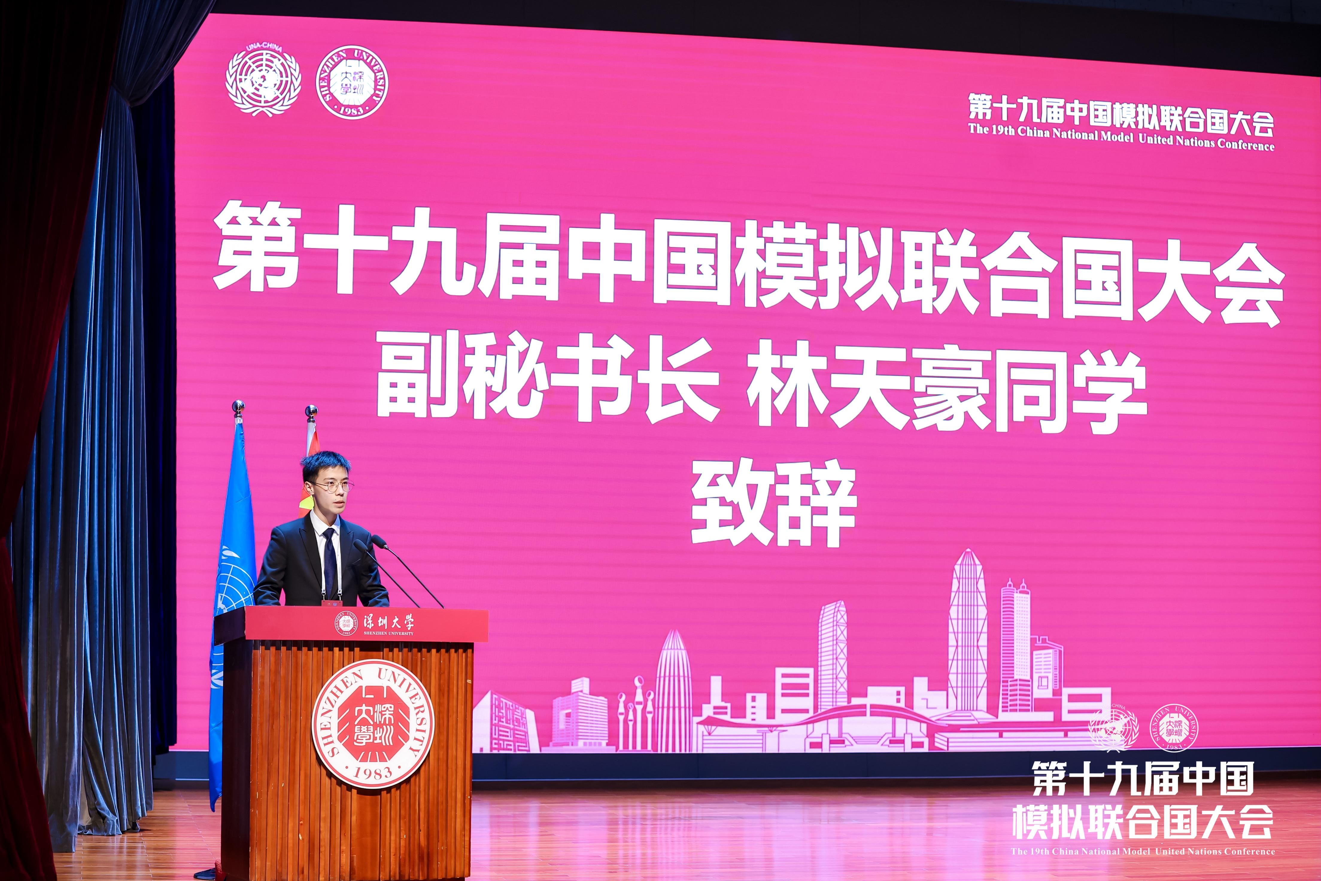 林天豪回顾几个月来的大会筹备历程,表示中国模拟联合国大会不仅是展示青年才智的平台,更是培养大学生综合实践能力、提高综合素质的良好机会。他呼吁学子们继续携手共进,为共同的理念而努力奋斗,继续关注全球性问题,用行动践行联合国理念与价值观。