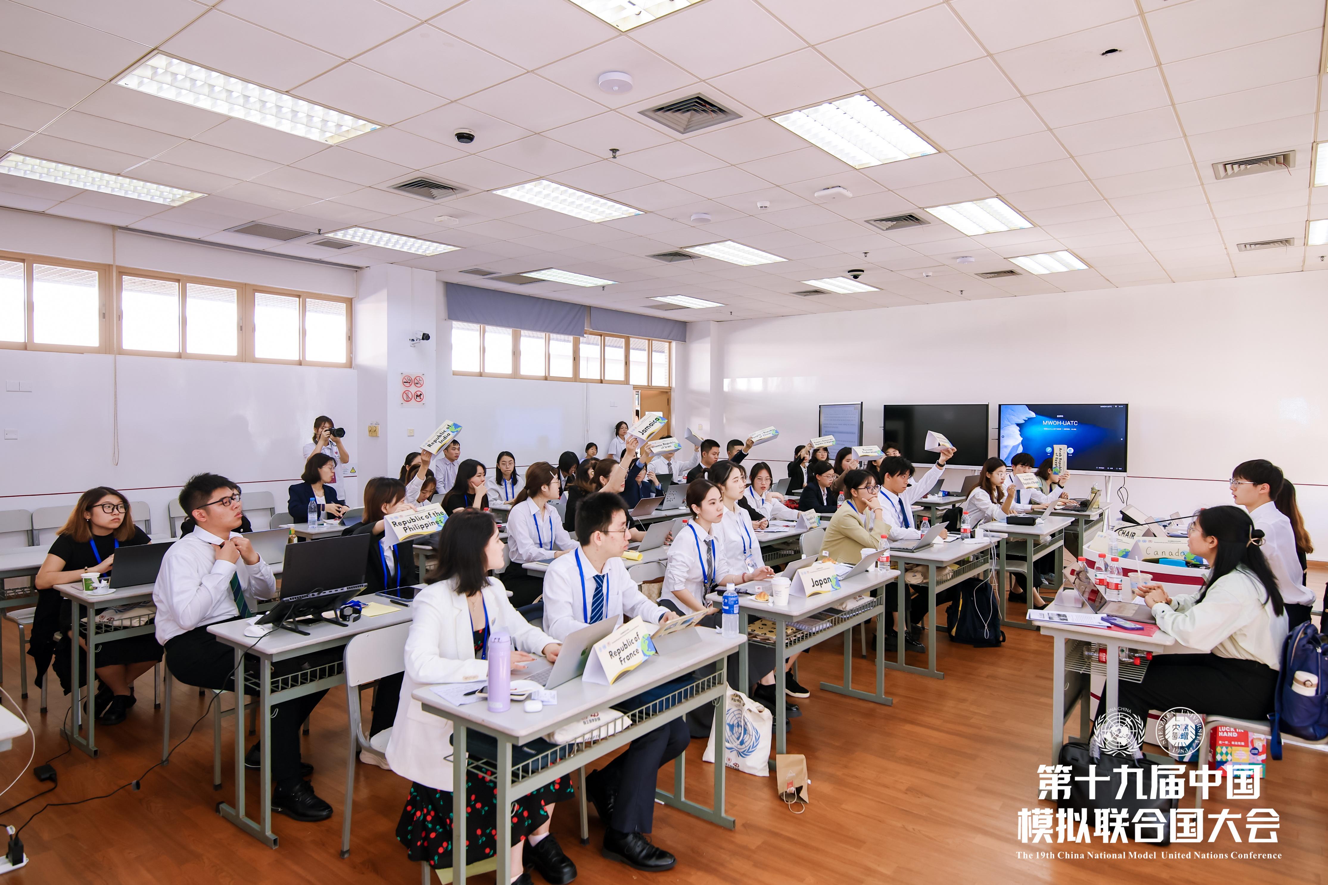 在三天的会期中,来自74所高校的近300名学生代表分别在联合国大会第一委员会、联合国大会第三委员会、联合国开发计划署、联合国粮食及农业组织、国际民航组织、联合国气候变化大会、主新闻中心七个会场,模拟各国外交官,就政治安全、文化、农业、气候、航空等发展议题展开辩论、磋商等共4轮会议。会议现场座无虚席,代表们的桌子上摆放着文件、电脑和所代表国家的桌牌,“外交官们”有条不紊地进行发言前准备。