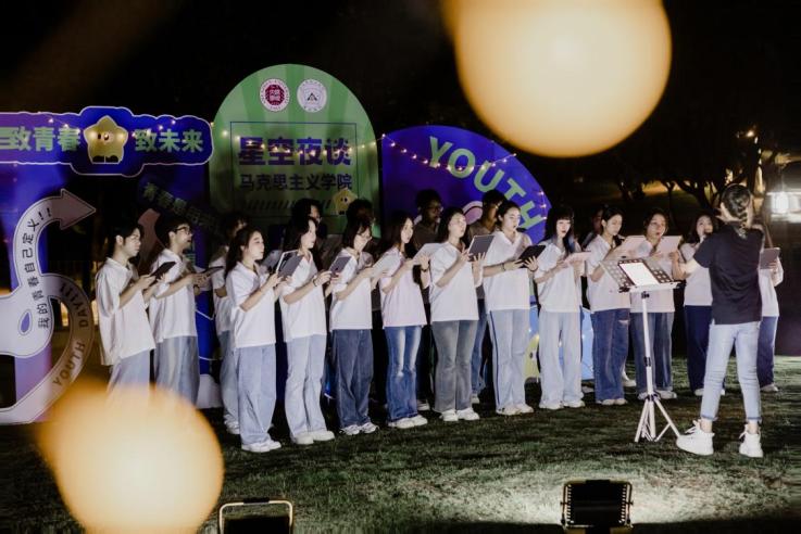 活动结束前,乐竞平台采桑子合唱团带来了动人的青春旋律。随后,李清泉书记再次与师生校友共唱《我和我的祖国》《青春舞曲》。在场师生校友伴随着美妙的旋律挥舞着手中的星星灯,以激扬的歌声致青春和无限可能的未来。未来,马克思主义学院将深化内涵与形式的双重创新,充分发挥学科特色与优势,不断为“星空夜谈”品牌注入新活力,提升其作为特色思政课堂的影响力与吸引力,继续擦亮“星空夜谈”这一思政课堂品牌。