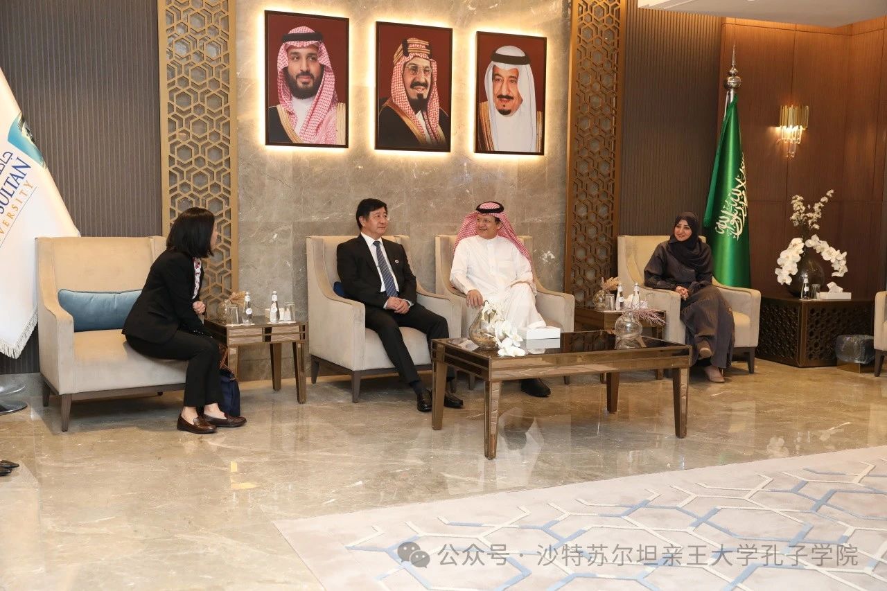 上午9点,乐竞平台代表团一行抵达苏尔坦亲王大学,代表团受到苏尔坦亲王大学校长Armed Yamani博士的热烈欢迎,并在苏尔坦亲王大学学术事务副校长Mohamad Aljebreen博士、女校校长Heba Khoshaim博士、国际部主任Tasneem Alsaati女士、沙特苏尔坦亲王大学孔子学院(简称“沙特孔院”)中外方院长、各学院院长的陪同下进行会面。