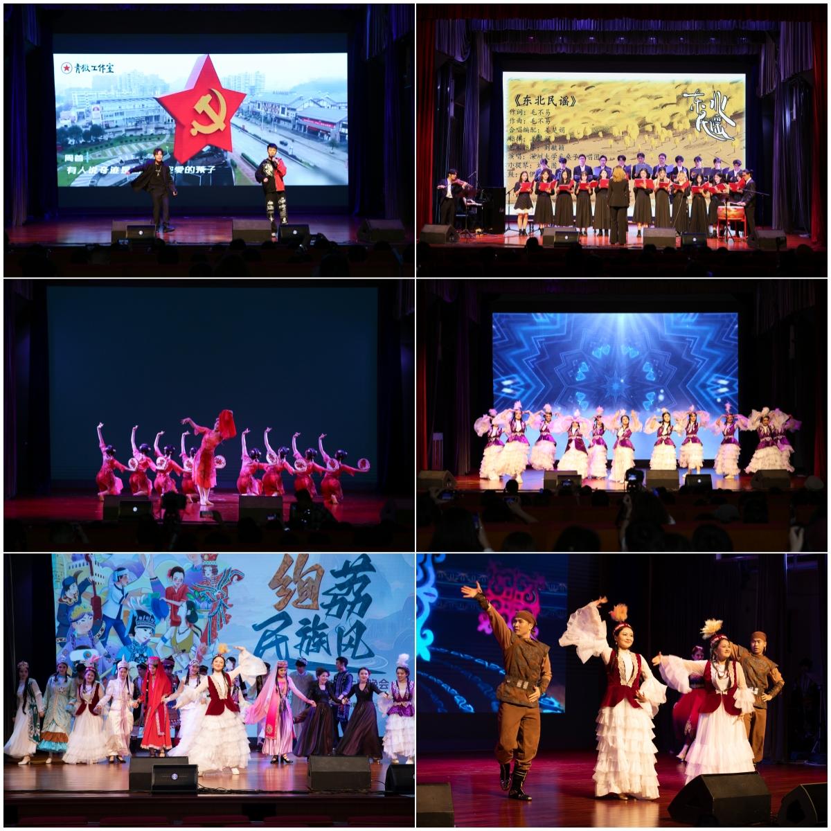 晚会现场,汉族、维吾尔族、哈萨克族、蒙古族、藏族等各民族学生带来了独具特色的文艺表演,既有民族特色、又能体现各民族学生团结一心的歌舞节目给现场观众留下深刻印象。