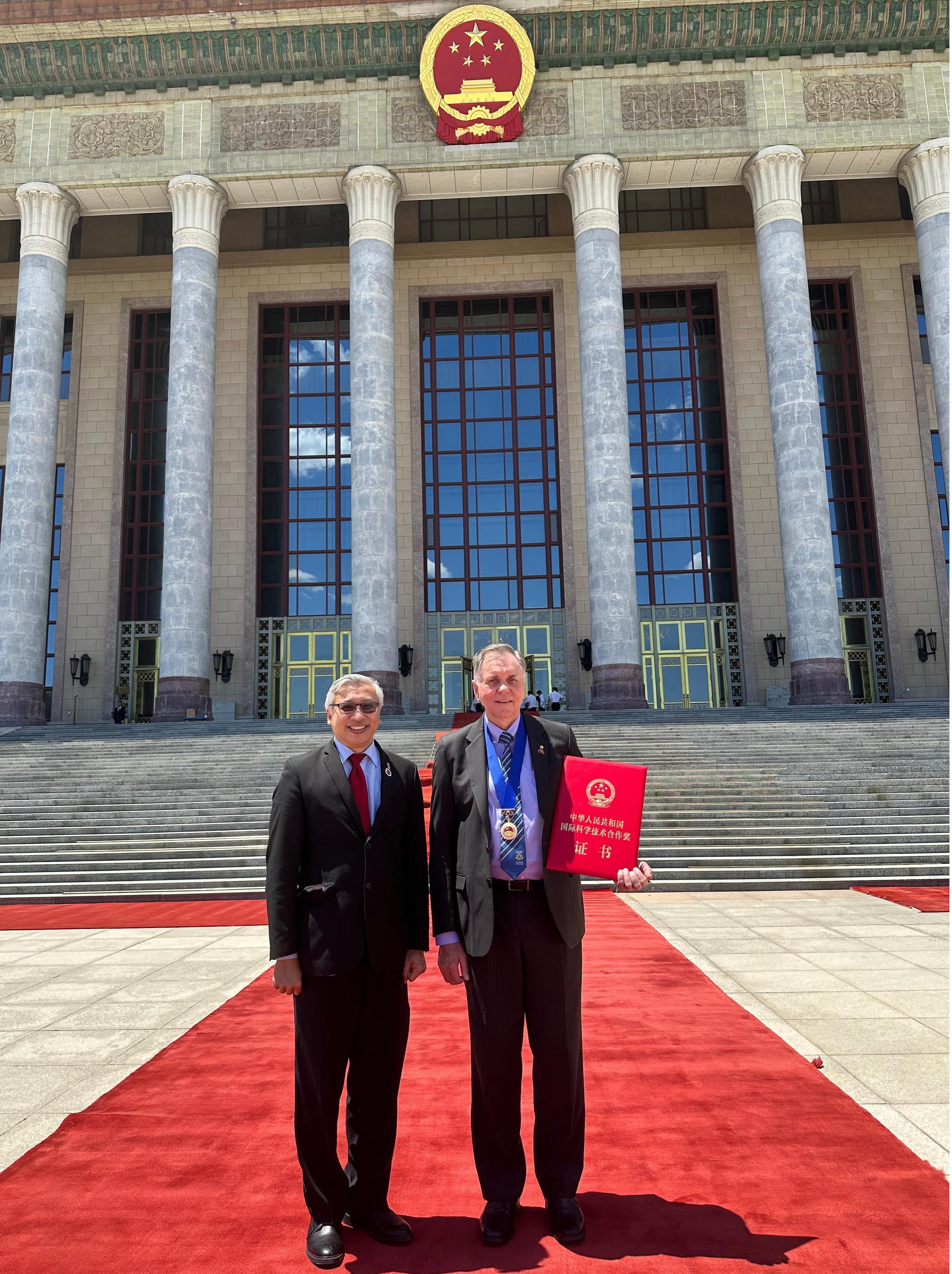 巴里·马歇尔(右)受奖后在人民大会堂门前留影