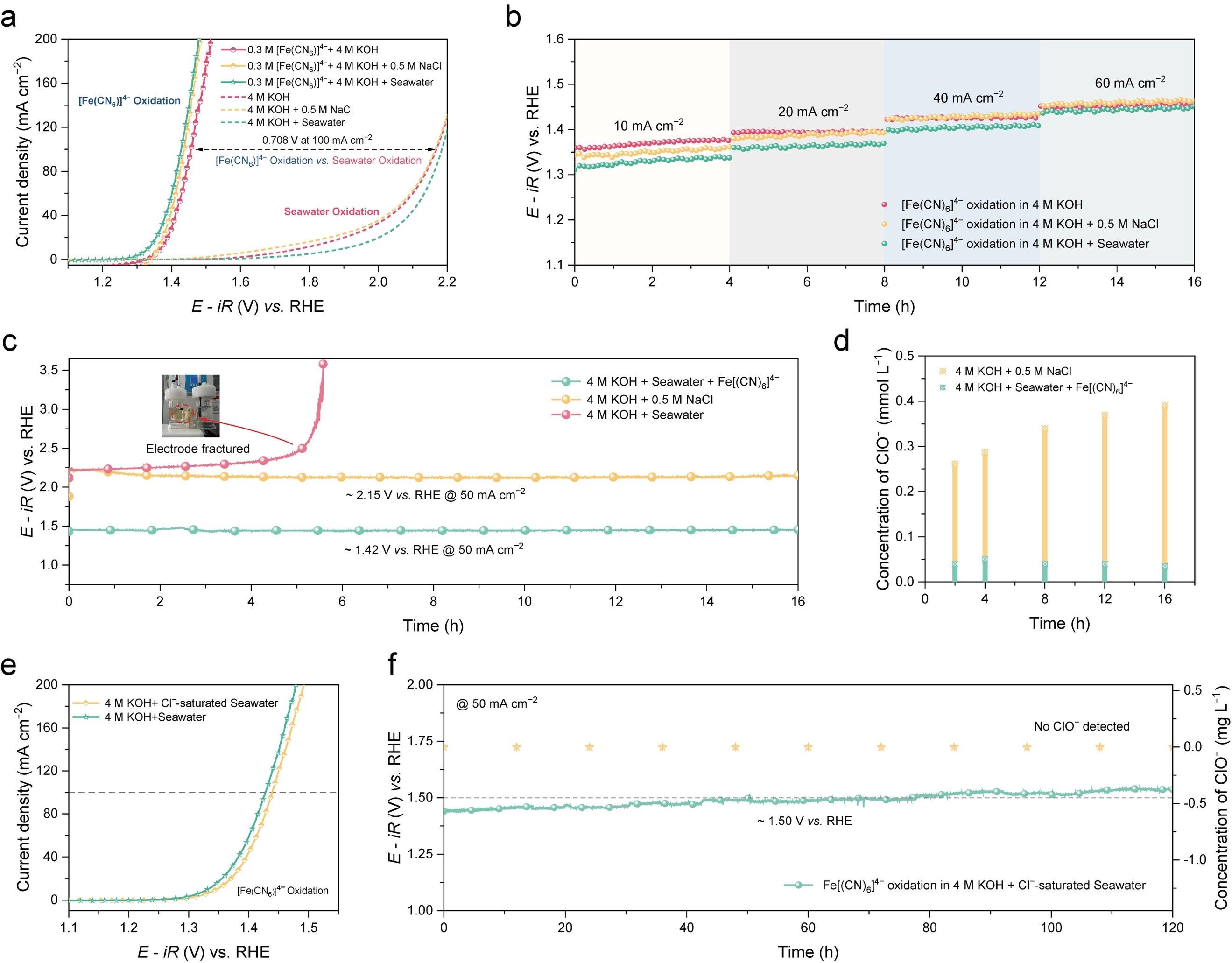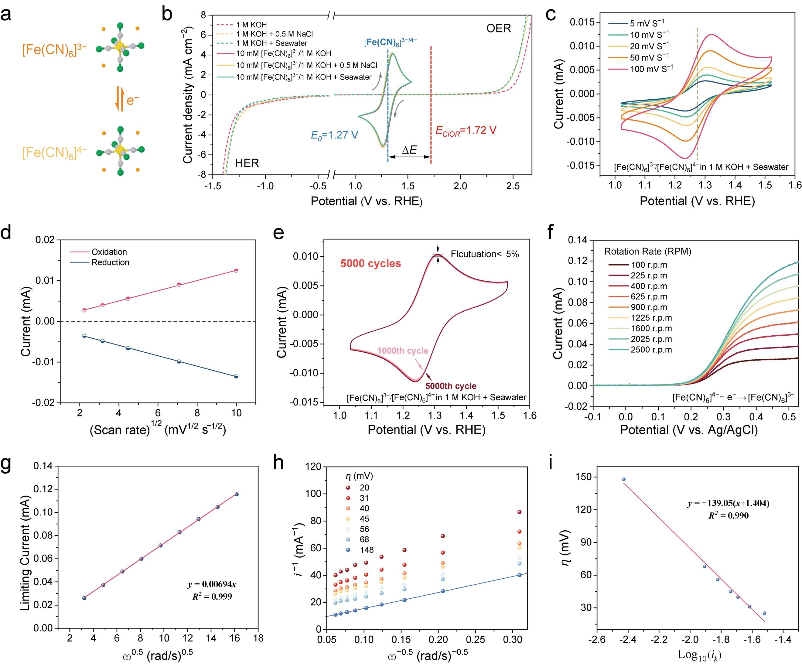 该研究针对海水制氢中最棘手的氯离子干扰难题,引入氧化还原介导的解耦策略,利用兼具热力学和动力学优势的阳极反应,巧妙规避了传统电解水制氢过程中析氧反应与氯离子反应的直接竞争,大幅降低了电化学腐蚀。在该研究中,[Fe(CN)6]3−/4−电对在海水中不仅保持了优异的可逆氧化还原动力学特性,而且在200 mA cm−2的接近工业级电流密度下实现了超过250小时的长时间稳定运行。