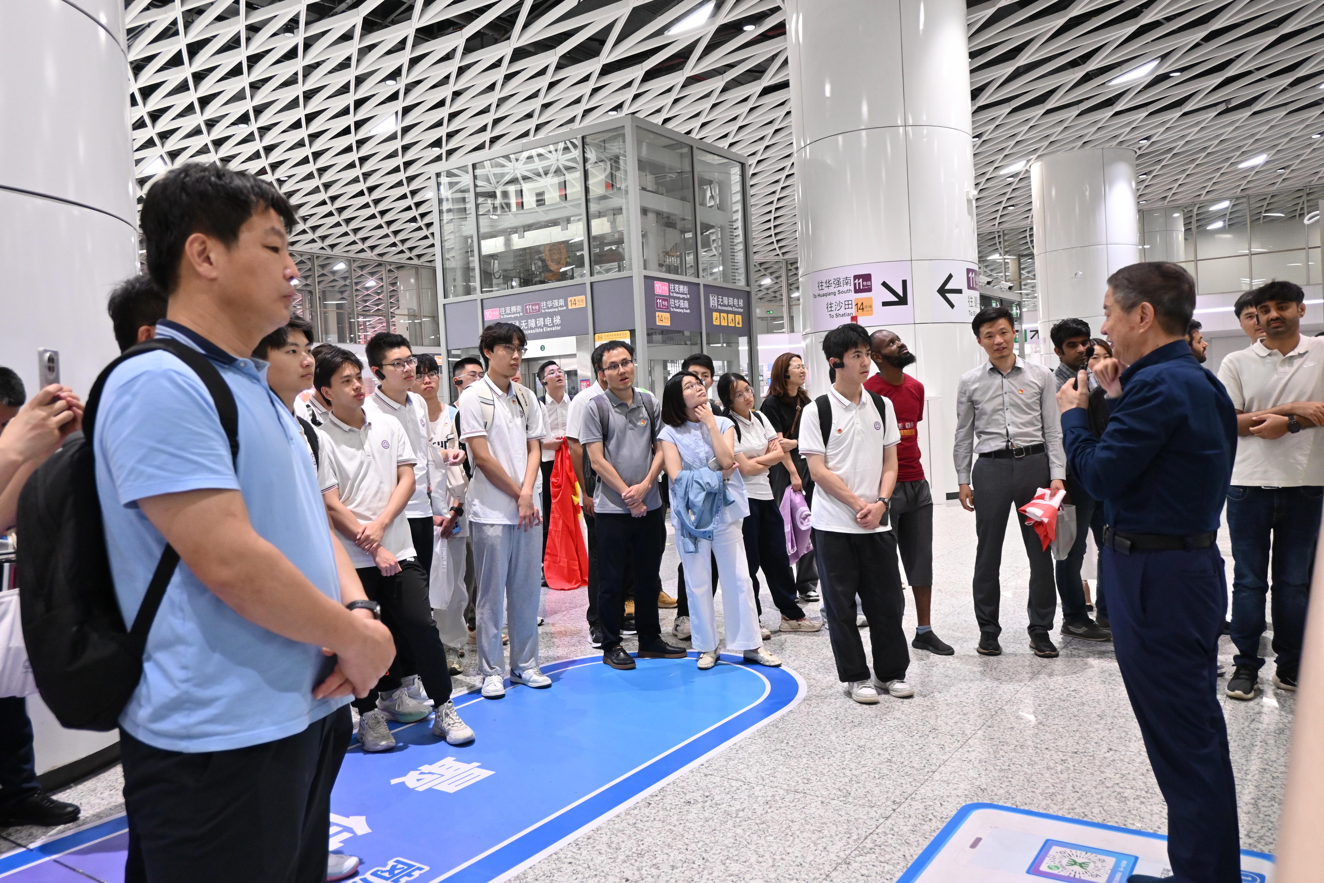 随后,师生又来到了被誉为“中国最美地铁站”的深圳岗厦北地下枢纽。作为五线交汇的重要交通枢纽,该站拥有22.49万平方米的宏大体量、48×51米无柱式空间设计和融合“科技+艺术”的赛博朋克风格,令人叹为观止。