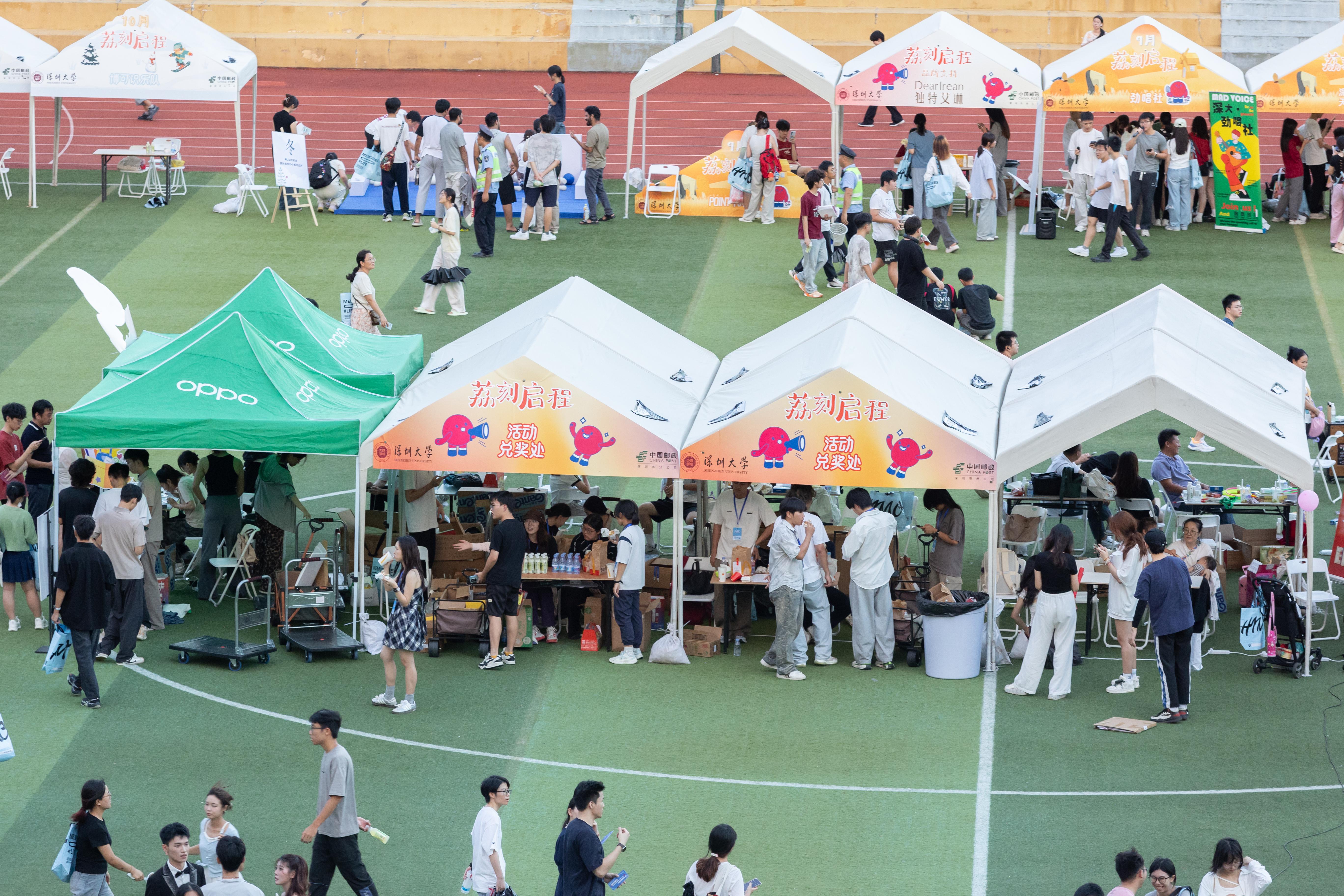 粤海校区飞盘广场人头攒动。80个社团摊位组成了“S”“Z”“U”三个字母,飞盘社的扔飞盘体验摊位前早已排起长队,天文协会摊位前摆放的天文望远镜最为吸睛,赛艇队的摊位也人气很旺,参与者在测功仪上奋力比拼“200米划行”。校园乐队、舞团激情登场,舞台快闪活动吸引了不少留学生,来自法国的Theo和Yann感慨:“我们学校的活动太有氛围感了!”休闲美食摊位则用味蕾唤醒了校友们的青春记忆。