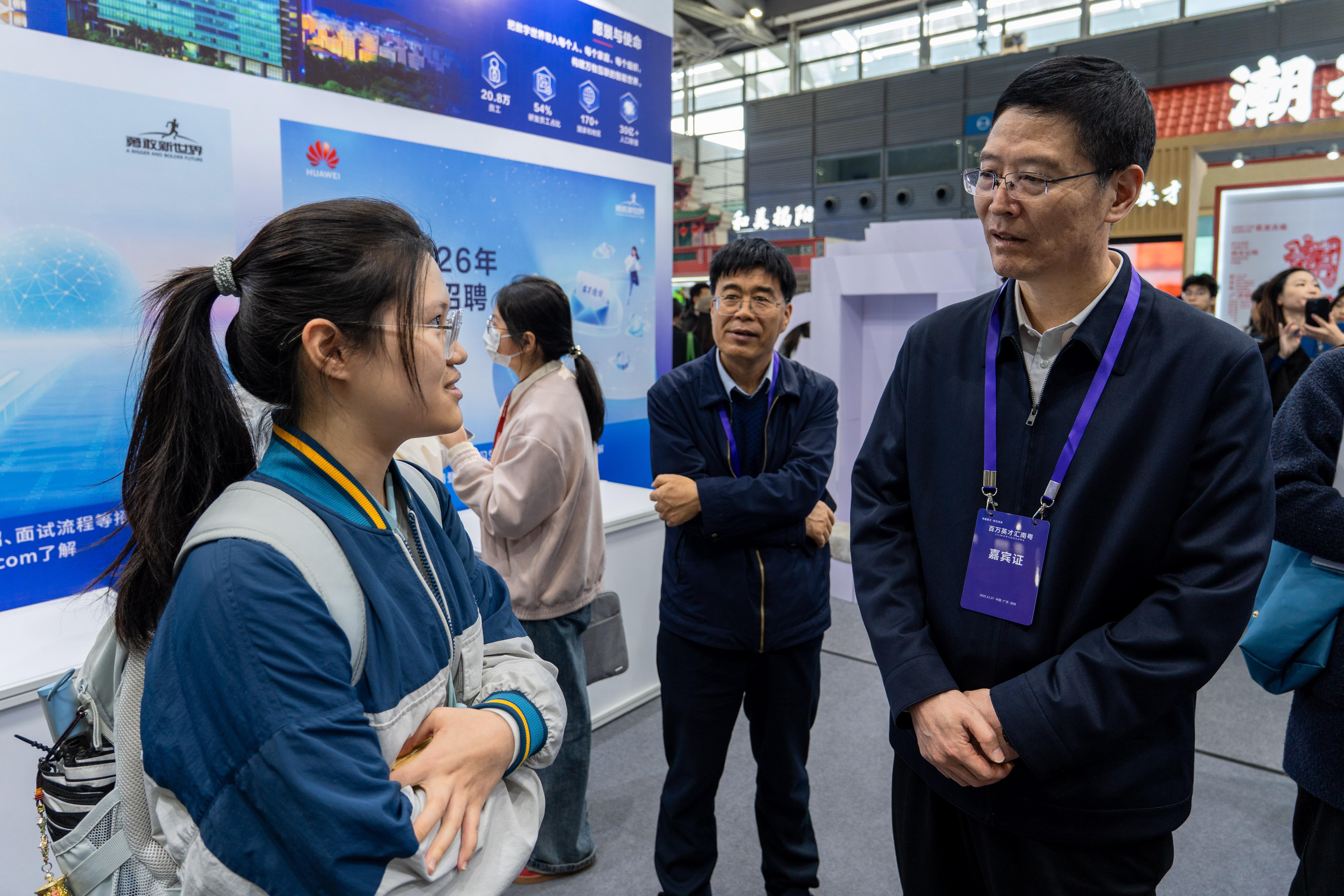 在华为的招聘展位前,徐波一行与该企业招聘负责人展开交流,了解深大毕业生就职和应届生求职情况。他表示,深大与华为已形成了密切的校企合作关系,期待双方未来能进一步协同拓展人才培养的空间。在现场,徐波与电子与信息工程学院的赵同学等多位前来应聘的学生亲切交流。他仔细询问求职学生的情况:“就读的什么专业?是否找到匹配度合适的岗位?与意向单位沟通顺利吗?”他勉励学生夯实专业基础,主动了解行业动态,为未来的职业发展做好准备。