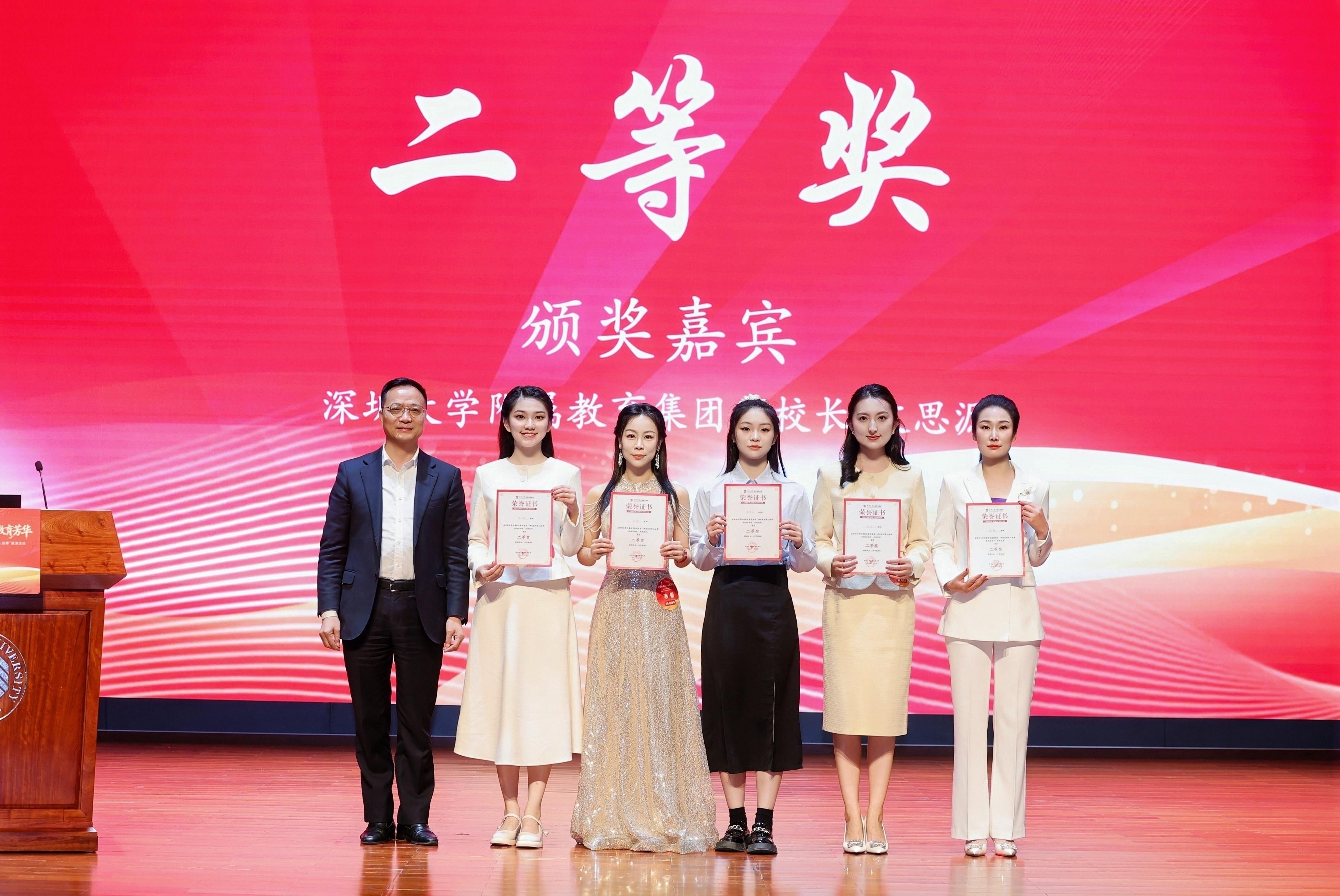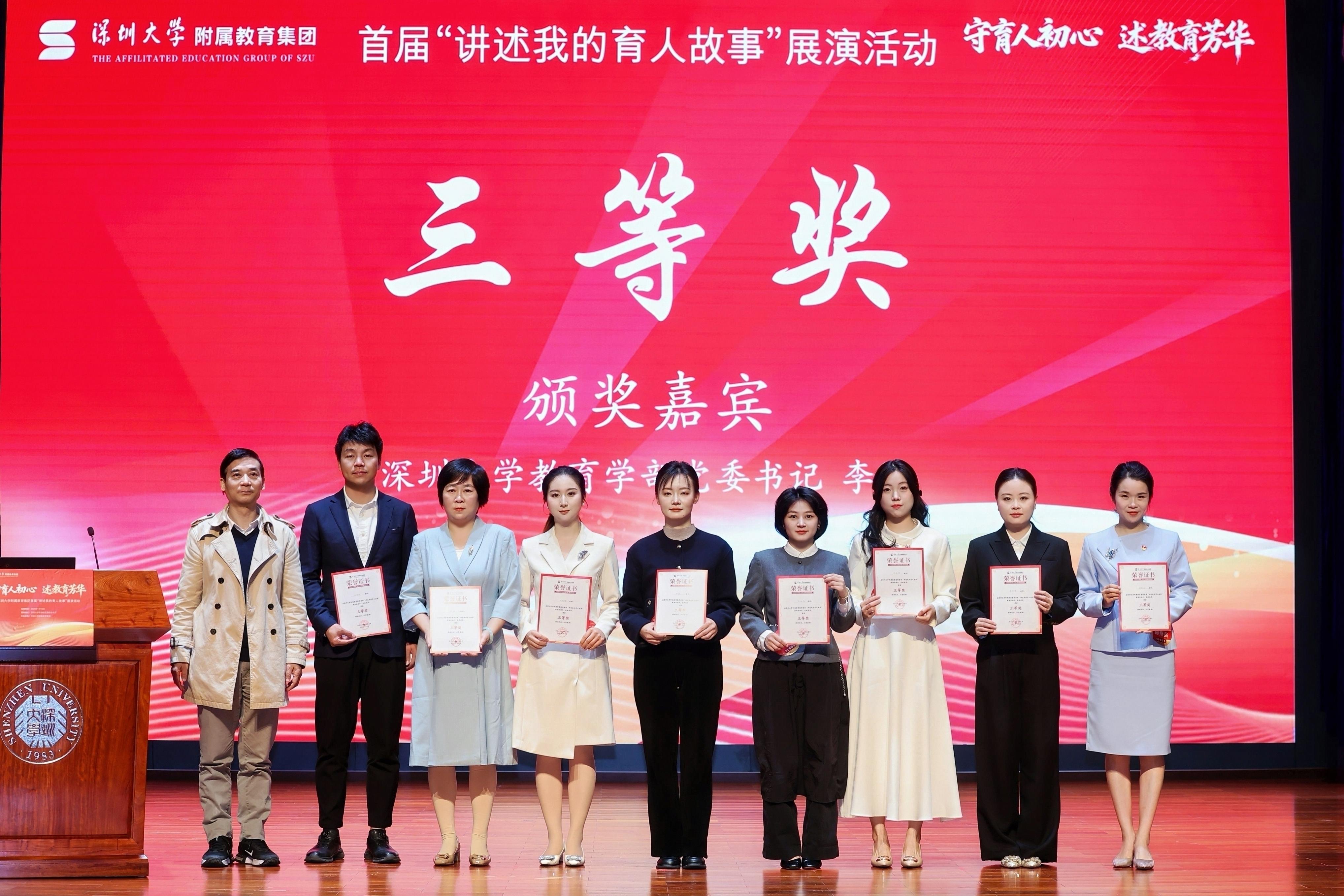 经评审组汇评,此次展演共评选出一等奖4名、二等奖5名、三等奖8名以及最佳感染力奖、最佳创意呈现奖各2名,优秀组织奖6个(单位)。其中,乐竞平台附属中学陈妍冰、乐竞平台附属南山幼儿园李镘婵、乐竞平台附属后海小学奚源浩、乐竞平台附属实验中学王梦林获得一等奖;乐竞平台附属中学、乐竞平台附属后海小学、乐竞平台附属南山幼儿园、乐竞平台附属实验中学、乐竞平台附属坂田学校、乐竞平台附属中学宝安学校获得优秀组织奖。徐波,集团总校长文思源,教育学部党委书记李臣、执行主任李均分别为获奖选手和单位颁奖。