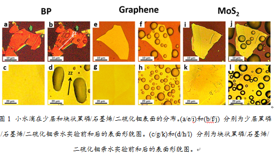 二维黑磷晶体材料由于具有天然的沟槽状的原子排列结构,导致其在相互垂直的Armchair和Zigzag方向具有非常明显的各项异性的特性,如各向异性的电学性能、光学性能、机械性能、热电性能等。针对黑磷的各向异性原子排列结构,作者设计了一个水滴在黑磷晶体表面凝结的动态实验,并运用光学显微镜将小水滴在黑磷晶体表面凝固的整个过程记录下来。实验结果表明,凝结在黑磷晶体表面的小水滴形状为椭球形,且其长轴为黑磷晶体的Zigzag方向。然而,在同样条件下,在不具备各向异性原子排列结构的石墨烯和二硫化钼表面所形成的小水滴为圆球形。分子动力学模拟计算结果表明,水分子在沿着黑磷晶体Zigzag方向具有最小的能量,结构相对稳定。而水分子在石墨烯和二硫化钼晶体表面各个方向分布能量相差不大,因此不具备各向异性的亲水性能。作者进一步利用偏振拉曼光谱验证水滴各项异性亲水性能的准确性和可靠性,采用原位拉曼光谱的特征峰的位置和强度变化以及黑磷FET的电学性能来验证亲水实验对黑磷晶体的无损性。该工作首次提出了小水滴在各项异性的二维材料晶体表面各项异性的分布现象。同时该方法可用做二维材料各项异性原子排列方向快速(<10 s)鉴定,对各项异性的光学器件、光电器件、光热器件和纳米机械器件的制备和应用具有非常重要的指导意义。
