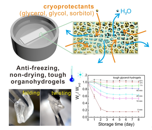 韧性水凝胶,一种具有良好机械性能的水凝胶,在组织工程、健康医疗、电子皮肤、软体机器人等领域具有重要的应用前景,近年来引起了研究人员的极大关注。但由于极高的含水量,导致了其在干燥、低温环境中分别容易失水和结冰,极大地限制了它的使用范围和实际应用场景。最近,周学昌课题组发明了一种新型的溶剂置换法,将韧性水凝胶成功改造成低蒸发且抗结冰的含水量可控韧性有机凝胶,从而解决韧性凝胶在空气中易干和低温下易结冰问题。该方法简单易行、成本低廉、通用性强,有望推动和进一步扩展韧性水凝胶甚至是水凝胶在复杂环境中(尤其是极端低温、干燥甚至真空条件下)的实际应用。