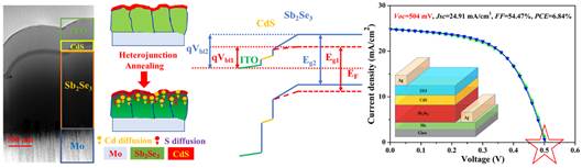 近年来,新型环境友好型Sb2Se3材料由于物相单一,光学带隙可调以及较高的光吸收系数,介电常数和载流子迁移率等优点,在无机薄膜太阳电池领域得到广泛关注和研究,但Sb2Se3薄膜太阳电池性能与CIGS薄膜太阳电池性能相比还有较大差距,其中主要原因是Sb2Se3材料自身有效掺杂浓度较低,整体表现为电池开路电压亏损偏高。前期,课题组提出采用与CIGS太阳电池生产工艺兼容性较高的磁控溅射技术结合后硒化热诱导生长出高度择优取向的Sb2Se3薄膜,并制备出光电转换效率为6.06 %的Sb2Se3薄膜太阳电池,相关成果发表在Nano Energy. 64. 2019. 103929;本文则报道Sb2Se3薄膜太阳电池中的异质结Sb2Se3/CdS在经过热处理后,发现Cd2+和S2-离子扩散进入光吸收层Sb2Se3内,器件光电转换效率提升至6.84%,其中开路电压提升至504 mV(是目前已报道的Sb2Se3薄膜太阳电池最高开路电压值),分析原因主要是Cd2+有效掺杂获得P型导电增强和S2-离子掺杂光学带隙拓宽,相关成果发表在Nano Energy. 73. 2020. 104806。此外,将无封装的全无机Sb2Se3薄膜太阳电池存放于空气中,1000小时内仍能保证90%的初始光电转换效率,显示了良好的稳定性。