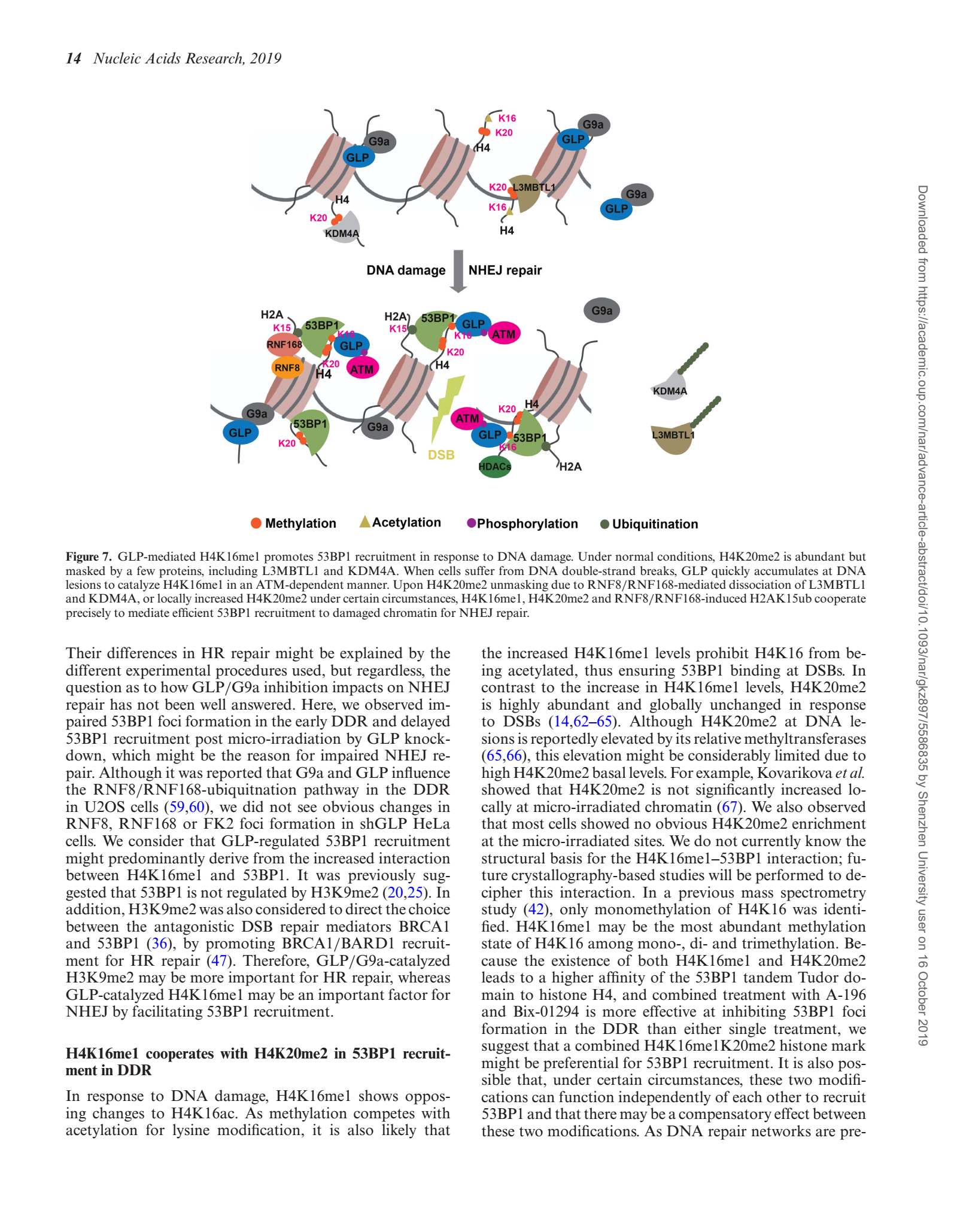 该研究针对H4K16位点是否有甲基化修饰参与DNA损伤修复展开研究。通过开发H4K16特异性甲基化抗体,利用电离辐射和DNA损伤诱导药物鉴定出参与DNA损伤修复的新修饰H4K16单甲基化(H4K16me1)。进一步的,该团队通过利用分子生物学和细胞生物学研究方法,鉴定出了体内体外可以催化H4K16me1的组蛋白甲基转移酶GLP。DNA损伤应答中,GLP被快速招募到DNA损伤位点,催化组蛋白H4K16me1。研究表明GLP和H4K16me1对DNA修复重要蛋白53BP1的招募起重要作用。和H4K16ac功能相反,H4K16me1可以和H4K20me2协同作用,共同促进53BP1的招募。此外,该研究还发现了组蛋白甲基转移酶GLP独立于和G9a的招募,以及发现重要蛋白激酶ATM参与了DNA损伤修复中GLP的招募和H4K16me1的建立。