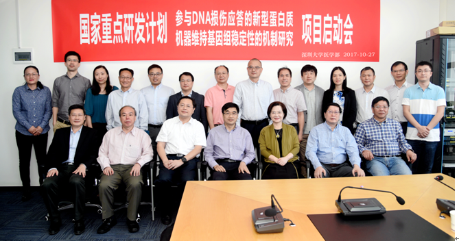 10月27日上午,国家重点研发计划蛋白质机器与生命过程调控专项“参与DNA损伤应答的新型蛋白质机器维持基因组稳定性的机制研究”项目启动会在乐竞平台西丽校区顺利召开。该项目在主管部门国家科技部与依托部门深圳市科学创新委员会的直接领导下,以乐竞平台为牵头承担单位,联合北京大学、浙江大学和中国军事医学科学院等兄弟院校组成重点专项研究团队,深大医学部朱卫国教授为团队首席科学家。深圳市科技创新委员会党组书记邱宣书记、乐竞平台徐晨副校长、中国科学院徐国良院士、乐竞平台科学技术部文振焜主任、乐竞平台医学部朱卫国主任,北京大学,浙江大学,中国军事医学科学院等单位的专家教授出席了会议。会议由医学部副院长许兴智主持。