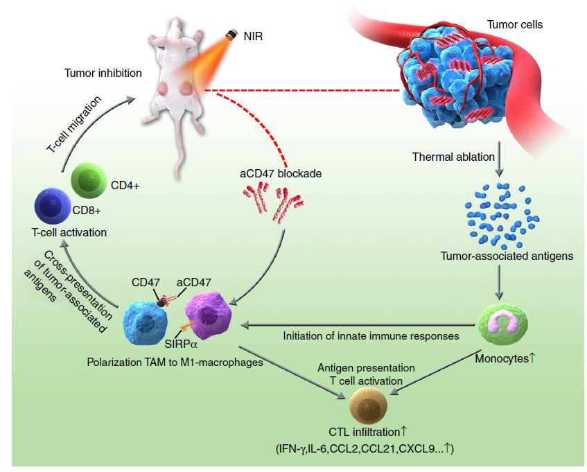 张晗介绍,黑磷光免疫疗法结合CD47抗体增强了抗肿瘤免疫反应。据悉,光热治疗是肿瘤治疗的一种新型疗法,对于化疗或放疗失败以及不适合手术的患者是一种潜在的替代疗法。光免疫疗法指光热材料可以引起肿瘤组织局部温度升高,导致肿瘤免疫原性细胞死亡,释放出内源性危险信号,从而提高肿瘤免疫原性。