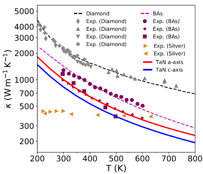 图:氮化钽,金刚石,砷化硼和银的热导率。