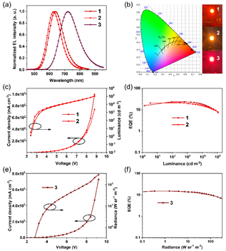 Figure 2.(a) Normalized EL spectra of the red and NIR devices. (b) CIEx,ycoordinates and photographs of the operating devices at 1000 cd m-2. (c) J-L-V characteristics and (d) EQEs versus the luminance of the red OLEDs doped with1(12 wt.%) or2(9 wt.%). (e) J-R-V characteristics and (f) EQEs versus the radiance of the NIR OLED doped with3(6 wt.%).