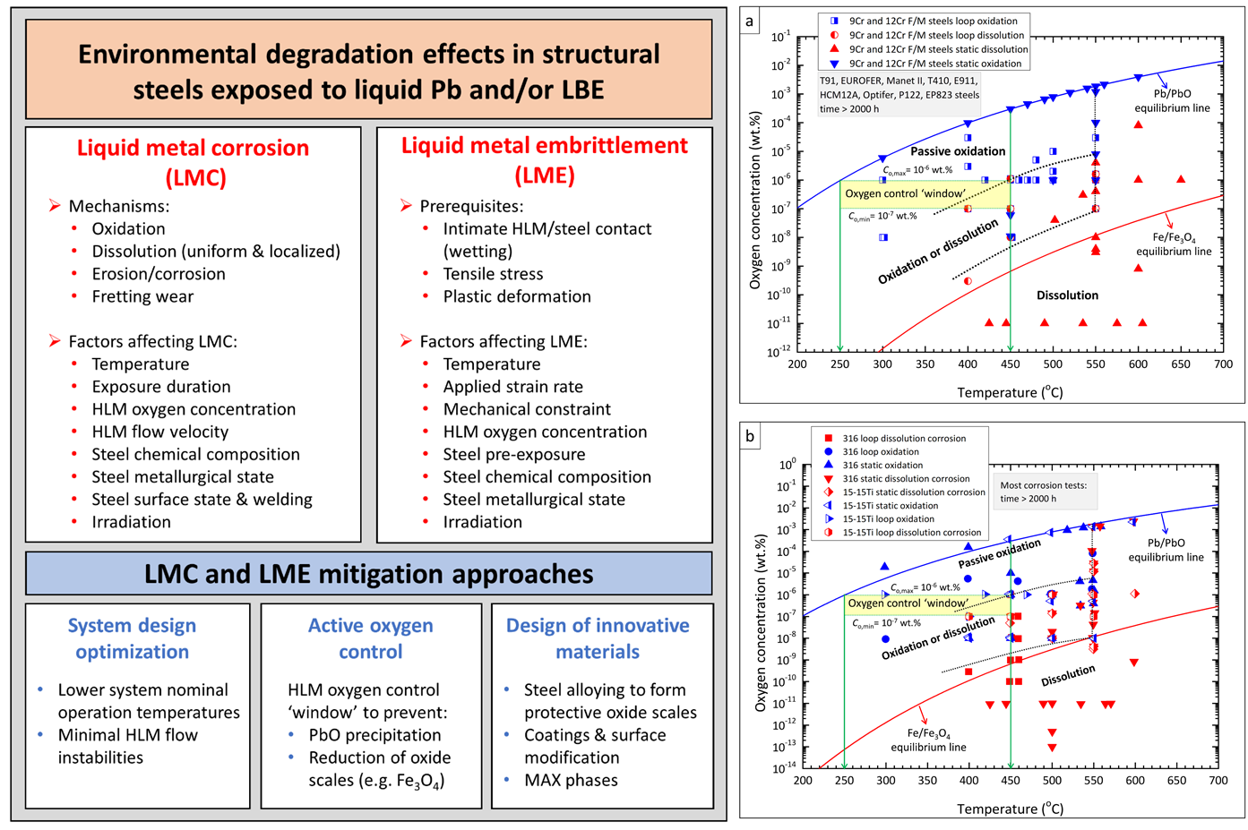该论文首先介绍了液态铅和铅铋共晶合金作为核反应堆冷却剂的优点以及应用前景、概括了结构材料(主要包括商用不锈钢)在液态铅和铅铋介质中面临的主要性能环境退化效应和相关抑制技术手段,然后详细综述了316L、15-15Ti和T91等三种结构钢在液态铅铋(和铅)环境中的液态金属腐蚀和液态金属脆化这两种最重要的性能退化现象的基本特点、关键影响因素和微观机理,并综述了抑制这两种性能退化效应的技术手段的优缺点,包括系统设计优化(优化堆内构件几何形状降低紊流等)、主动氧控(结合大量腐蚀数据绘制了详细的316L系列奥氏体不锈钢和9Cr/12Cr铁素体/马氏体钢的氧控边界图)、材料改进(合金化、表面涂层、新材料开发如高熵合金、MAX相等),论文最后总结了不锈钢的液态金属腐蚀和液态金属脆化性能的基本结论以及相关抑制技术措施、展望了铅基快堆材料近期和中长期发展方向。该综述论文对铅基快堆材料的发展具有重要参考作用。