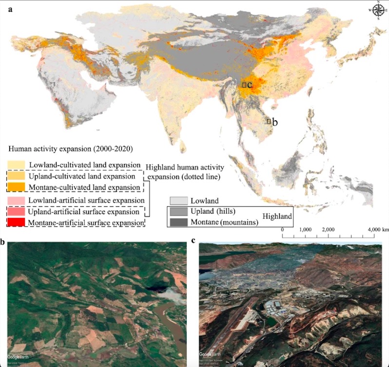 亚洲占世界陆地面积的三分之一,人口超过45亿,占全球人口的近60%。2000年以来,亚洲人口增加了8.5亿,而且随着经济社会发展,人类活动强度和范围日益加剧,人-地关系和矛盾也趋于紧张。相比于平原、低洼及非坡地,高地(丘陵和山地区域)通常在经济和环境上不太适合密集的人类活动(比如农业、工业、交通和人类住区等)。另一方面,高地是生态脆弱的地区,在生物多样性保护(约为33%的陆地生物多样性提供栖息地)、碳封存、供水(超过全球淡水的50%)、水资源涵养和保护中发挥重要作用。零星报告表明,人类活动在一些亚洲高地呈现逐步扩大态势,然而,人类活动在亚洲高地扩张的特征及其可见影响并不清晰。