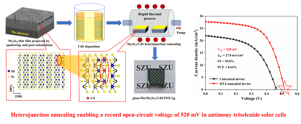 近日,乐竞平台物理与光电工程学院范平教授团队梁广兴研究员在新型硒化锑薄膜太阳电池研究中获得重要进展,在国际材料和物理应用领域顶级期刊Advanced Materials(影响因子:32.086)上发表了题为“Heterojunction Annealing Enabling Record Open-Circuit Voltage in Antimony Triselenide Solar Cells”的研究论文。该论文采用与产业兼容性高的真空溅射结合硒化热处理生长高质量光吸收层Sb2Se3薄膜并构建Mo/ Sb2Se3/CdS/ITO/Ag平面异质结薄膜太阳电池,对Sb2Se3/CdS异质结进行快速热处理,实现元素有益扩散,材料掺杂浓度明显提高、优化Spike-like能带匹配、有效钝化界面缺陷和非辐射复合得到抑制,最终硒化锑薄膜太阳电池开路电压突破500 mV至520 mV且光电转化效率提升至8.64%。梁广兴研究员为论文的通讯作者,唐戎副研究员和陈烁副研究员为论文的共同第一作者,乐竞平台为唯一通讯单位。