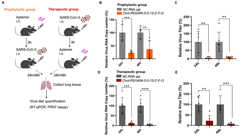 CRISmers理论上具有广泛的靶向性,但考虑到研究进行期间正值新冠疫情,该团队将第一个靶标指向了SARS-CoV-2刺突蛋白受体结构域RBD。通过初级筛选和二级验证,获得了可特异靶向RBD的2个优选的RNA适配体,且在体外呈现出有效的病毒检测和中和活性。有趣的是,和其他论文中报道的一致,核酸配体表现出不受病毒突变影响的现象,具有广谱抗SARS-CoV-2的潜力。这一现象也许和核酸配体内在的柔性结构特性有关。类似的,不同的CRISPR/Cas系统的向导RNA也观察到可以互换的现象。进一步,选取其中一条RNA适配体,团队发现,结合多种修饰和偶联,包括2’-氟嘧啶和2’-甲氧基RNA修饰(提升RNA稳定性),以及5’端胆固醇(呈递到呼吸道上皮细胞表面)和分子量为40kDa的聚乙二醇(延长体内半衰期)的偶联,经滴鼻给药,在小鼠体内实现了对Omicron BA.2活病毒的预防型和治疗型抗病毒中和活性。通过对比实验,团队发现胆固醇和聚乙二醇的偶联对于动物体内的活性不可或缺,尽管它们对于细胞水平上的中和活性可有可无。