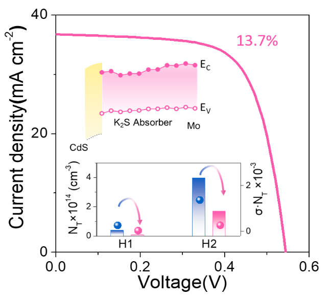 锌黄锡矿半导体Cu2ZnSn(SSe)4(CZTSSe)同样是因为其元素廉价无毒以及具有大于32%的理论光电转换效率成为很有前途的新型薄膜光伏材料之一。近年来CZTSSe薄膜太阳电池的效率不断攀升,但仍远低于其理论值,这主要归因于带隙和电位明显的波动,较短的少数载流子寿命以及缺陷引起的严重载流子复合;铜铟镓硒(CIGS)的成熟经验证明双梯度带隙结构使太阳电池兼具良好的电子输运特性和较高的开路电压,然而实现双梯度带隙结构对高温硒化成膜的CZTSSe太阳电池来说极具挑战。本文通过调整前驱体薄膜中K2S层的位置和K2S溶液的浓度,可实现调控带隙最小值(缺口)的位置和深度,避免由于不合适的前梯度起始位置和不理想的带隙缺口而产生的电子屏障;晶粒生长过程中K和Se的高亲和能容易形成K2Se3等K-Se液体中间相,它们沿着薄膜内的空隙和晶界流动,不仅降低熔点加速硒化,还可作为硒源使薄膜的硒化更加充分;碱金属K的引入促进了晶粒生长过程中各元素的扩散,使吸收层更大比例的组分参与晶粒生长,从而稳定Sn含量,深能级缺陷VSn和CuSn得到抑制,最终构建出CZTSSe薄膜太阳电池光电转换效率达到13.7%,属于国际领先水平,相关研究成果发表在Advanced Functional Materials (2023)2311992(影响因子:19.0,中科院JCR一区,Top期刊),梁广兴和苏正华为通讯作者,其指导的联合培养博士生赵云海为第一作者,乐竞平台为唯一通讯单位。