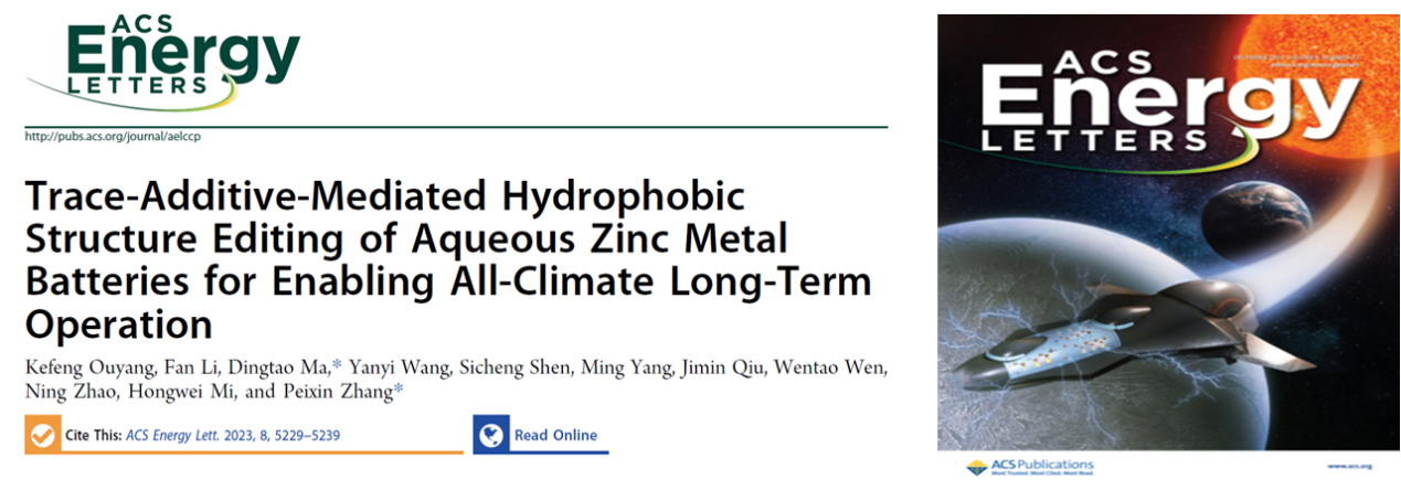 4.为解决Zn2+传输动力学缓慢和电解质界面热力学不稳定等问题,提出了痕量添加剂介导的疏水结构编辑概念,通过向水系电解液中添加聚丙烯酸(PAA)来重建电解液Zn2+溶剂化结构并实现电极-电解液界面原位自组装。重构的Zn2+水合结构具有快速的电化学反应动力学,而电极表面界面层极大提高了水系锌金属电池体系的热力学稳定性,从而实现了宽温域的长期运行。该成果作为封面文章发表在《ACS Energy Letters 》(2023,8:5229)。乐竞平台为第一完成单位和唯一通讯单位,研究生欧阳珂丰和李帆为论文第一作者,张培新教授和马定涛副研究员为共同通讯作者。论文链接:http://10.1021/acsenergylett.3c01872