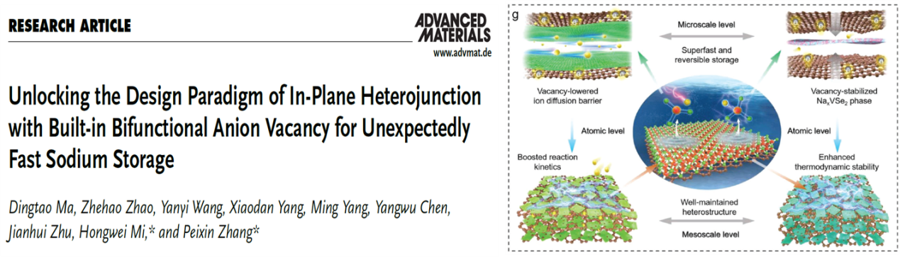 1.为解决过渡金属化合物作为钠离子电池负极材料容量低和循环性能差等问题,提出了一种独特的原位功能化和自限生长方法,以V2CTxMXene为模板,设计了具有内嵌阴离子空位的VSe2-x/C面内异质结,在加硒过程中,V2CTx的碳原子层转化为超薄的导电碳,最大限度地与生成的VSe2组分面对面接触。同时,碳还原环境的自发形成削弱了V-Se键,产生了丰富的Se阴离子空位结构,双功能阴离子空位与面内异质结构之间存在多尺度的界面协同作用,缓解了体积应变,提高了Na+插层和后续转化反应的动力学和热力学。该成果发表在《Advanced Materials》(2023:2310336),乐竞平台为第一完成单位和唯一通讯单位,马定涛副研究员和研究生赵哲浩为论文共同第一作者,张培新教授和米宏伟副教授为共同通讯作者。论文链接:https://doi:10.1002/adma.202310336