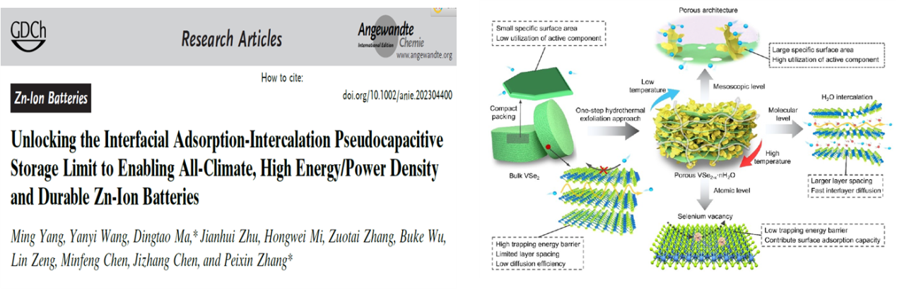 2.为解决用于锌离子存储的过渡金属硫族化合物(TMDs) 存储动力学缓慢和性能差等问题,提出了一种多尺度界面结构集成调制概念,以解锁全方位存储动力学增强的多孔VSe2-x·nH2O宿主,同时还发现了一种界面吸附-插层赝电容存储机制。这项工作实现了概念上的突破,扩展了层状TMDs的界面存储极限,以构建全天候高性能锌离子电池。该成果发表在《Angewandte Chemie International Edition》(2023,62:e202304400)。乐竞平台为第一完成单位和唯一通讯单位,博士研究生杨明为论文第一作者,张培新教授和马定涛副研究员为共同通讯作者。论文链接:https://doi.org/10.1002 / anie.202304400