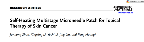 近日,乐竞平台医学部生物医学工程学院黄鹏特聘教授团队在国际顶级学术期刊《Advanced Materials》(影响因子29.4,中科院一区,TOP期刊)上发表了题为《Self-Heating Multistage Microneedle Patch for Topical Therapy of Skin Cancer》的研究论文。这篇论文的所有工作均在乐竞平台完成,该团队邵俊东副研究员(现为广州医科大学教授)和研究生李星星为论文共同第一作者,黄鹏教授为独立通讯作者,乐竞平台为唯一单位和唯一通讯单位,该团队所在的生物医学工程学科属于广东省优势重点学科。
