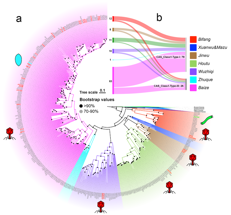 李猛教授团队采集了大量公共数据库中以及实验室特有的深古菌基因组,利用生物信息学方法,鉴定得到了4类属于不同科的古菌病毒。通过系统发育分析发现,这些病毒分属于两个不同的病毒域以及一个古菌特有的病毒科。为了弘扬中国经典文化,该团队以山海经中的神话人物为这些病毒命名,包括伏羲病毒科(Fuxiviridae)、鲲鹏病毒科(Kunpengviridae)、蚩尤病毒科(Chiyouviridae)和黄帝病毒科(Huangdiviridae)。分析还发现,这些深古菌病毒基因组中含有多个CRISPR-Cas系统元件的基因,包括编码一个特异的Type IV-B CRISPR-Cas系统及cas2和cas4蛋白。此外,研究人员还在病毒基因组中发现了mini-CRISPR array,为后续病毒反防御机制的研究打开了新的思路。
